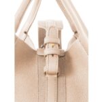 This small-sized Loro Piana Small Bale Bag Creamed Honey features a cotton and leather shoulder strap that wraps around the structure, creating a distinctive loop motif. The handle and strap design allow for both hand and shoulder carrying options.