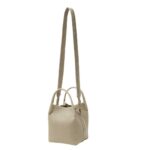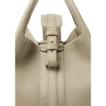 This small-sized Loro Piana Small Bale Bag Dried Taragon features a cotton and leather shoulder strap that wraps around the structure, creating a distinctive loop motif. The handle and strap design allow for both hand and shoulder carrying options.