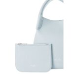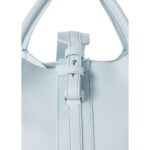 This small-sized Loro Piana Small Bale Bag Light Blue Belle features a cotton and leather shoulder strap that wraps around the structure, creating a distinctive loop motif. The handle and strap design allow for both hand and shoulder carrying options.