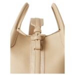 This small-sized Loro Piana Small Bale Bag Light Mastic features a cotton and leather shoulder strap that wraps around the structure, creating a distinctive loop motif. The handle and strap design allow for both hand and shoulder carrying options.
