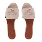 The Loro Piana Summer Charms Sandal Pink Nouveau is crafted from 100% suede goatskin, the leather is treated with a water-repellent and stain-resistant finish, ensuring durability while maintaining its soft, luxurious texture.