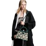 Inspired by the embroidery seen in this season’s Ready-To-Wear collection, the LOUIS VUITTON CAPUCINES BB handbag showcases a stunning baroque floral pattern crafted from finely embroidered lurex thread. This exquisite detail highlights Louis Vuitton’s exceptional craftsmanship and expertise. The handbag, in a sophisticated shade of green, combines luxurious velvet and lurex thread embroidery with calf-leather trim, offering a perfect blend of elegance and durability.