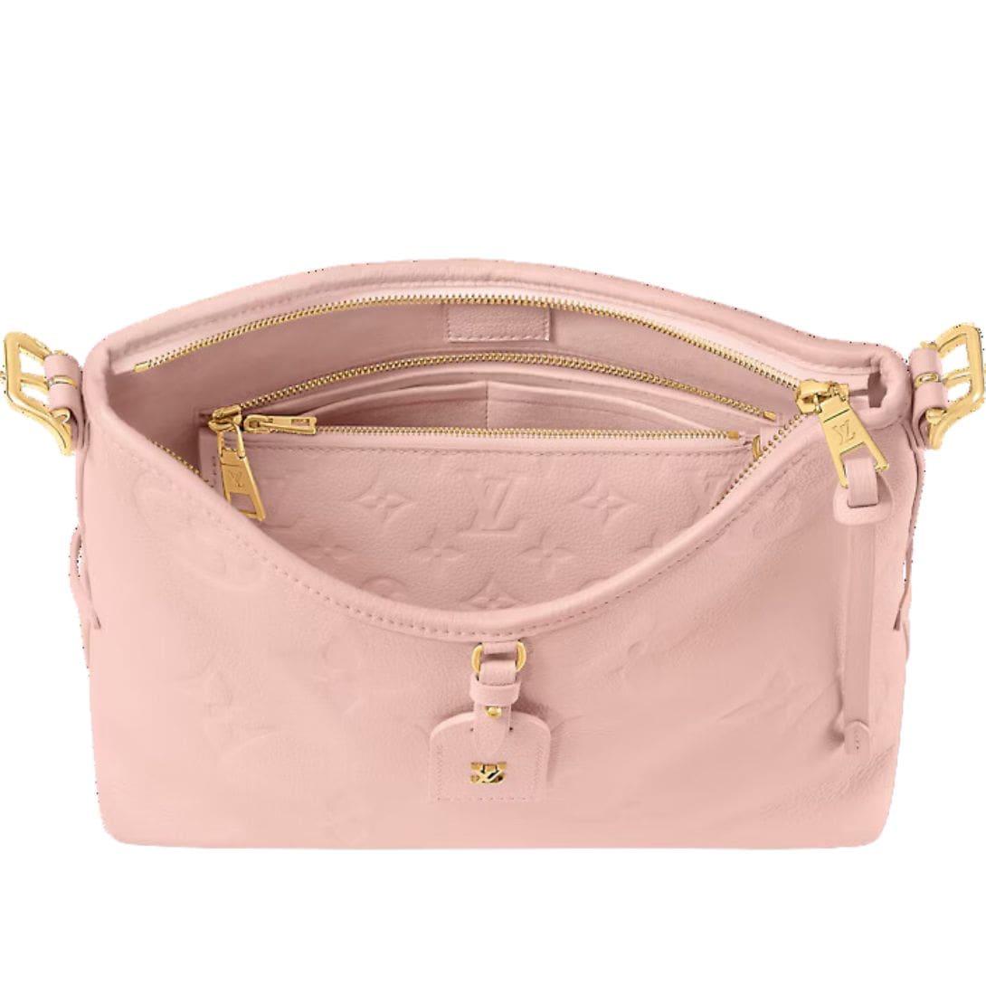 Elevate your style with the LOUIS VUITTON CARRYALL PM handbag, a delightful addition to this season’s collection, boasting a charming rose opal pink hue that adds a touch of femininity to any ensemble. Crafted from embossed Monogram Empreinte leather, this bag exudes sophistication and elegance, making it a versatile choice for both casual and chic daily wear.