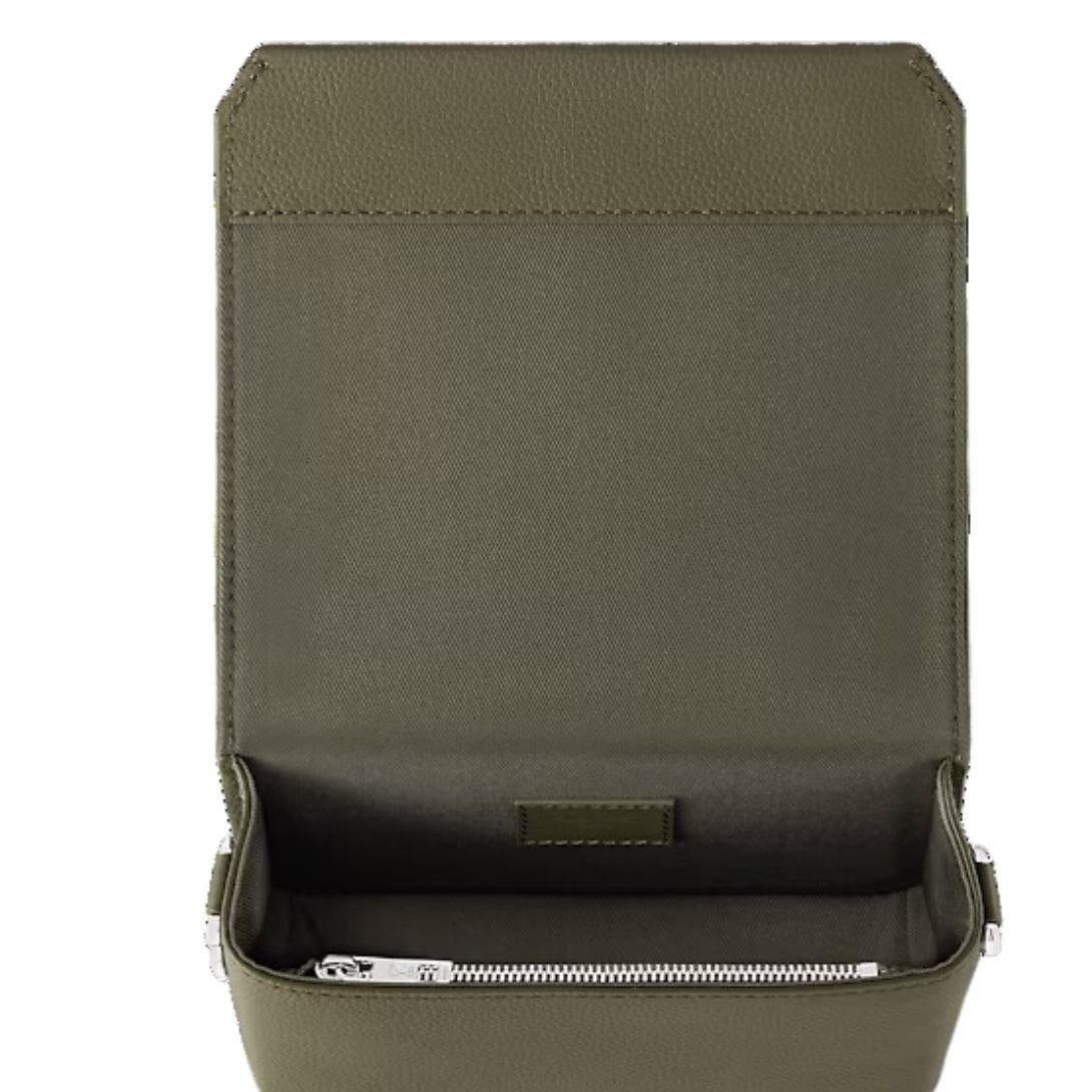 Measuring 6.8 x 4.7 x 2.8 inches, the LOUIS VUITTON FASTLINE WEARABLE WALLET offers a spacious main compartment secured by a magnetic flap closure, ensuring your valuables are safe and easily accessible. The interior includes a zipped pocket for added security and organization, while an exterior back pocket provides convenient access to frequently used items.