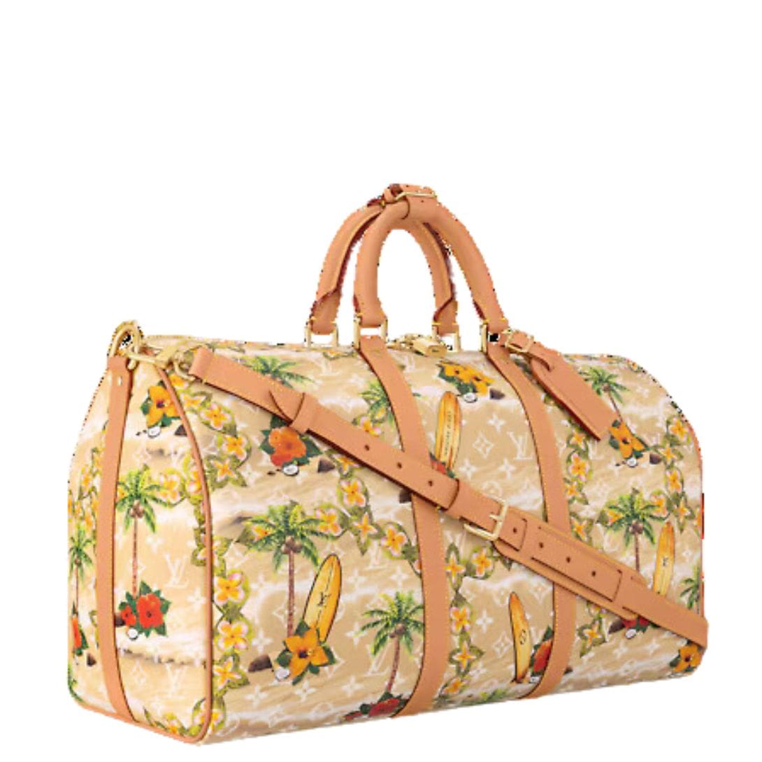 Introducing the classic LOUIS VUITTON KEEPALL BANDOULIERE 50 a striking travel bag reimagined in Pharrell Williams’ Monogram Surfin’ coated canvas. This distinctive piece features an elaborate print that artfully combines vintage-style tropical motifs with the timeless Monogram Flowers, creating a visually captivating design. The natural cowhide-leather trim adds a touch of vintage charm, making the bag a stylish yet functional travel companion.