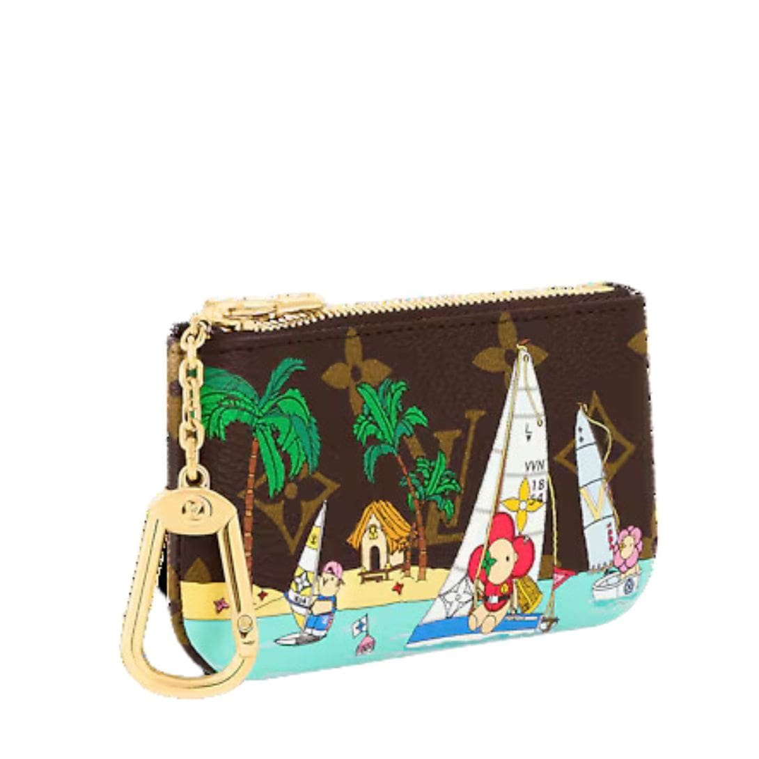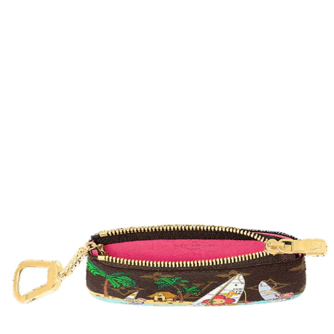 The Louis Vuitton Key Pouch is irresistibly charming, both inside and out. Its Monogram exterior is adorned with a whimsical print of Vivienne, the House mascot, sailing with her friends in tropical waters. This delightful scene is complemented by the vibrant dragon-fruit pink-grained leather lining, which matches Vivienne’s petals and the flag on her sailboat, adding a pop of color every time you open the pouch.