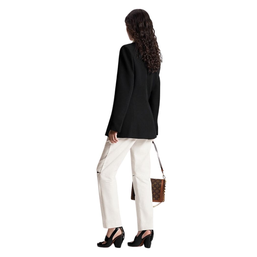 Functional and fashionable details enhance the blazer’s appeal. Zipped pockets provide a sleek and practical element, seamlessly integrating utility with style. The button-and-chain fastening not only secures the blazer but also adds a distinctive decorative touch, highlighting Louis Vuitton’s commitment to exquisite craftsmanship and attention to detail.