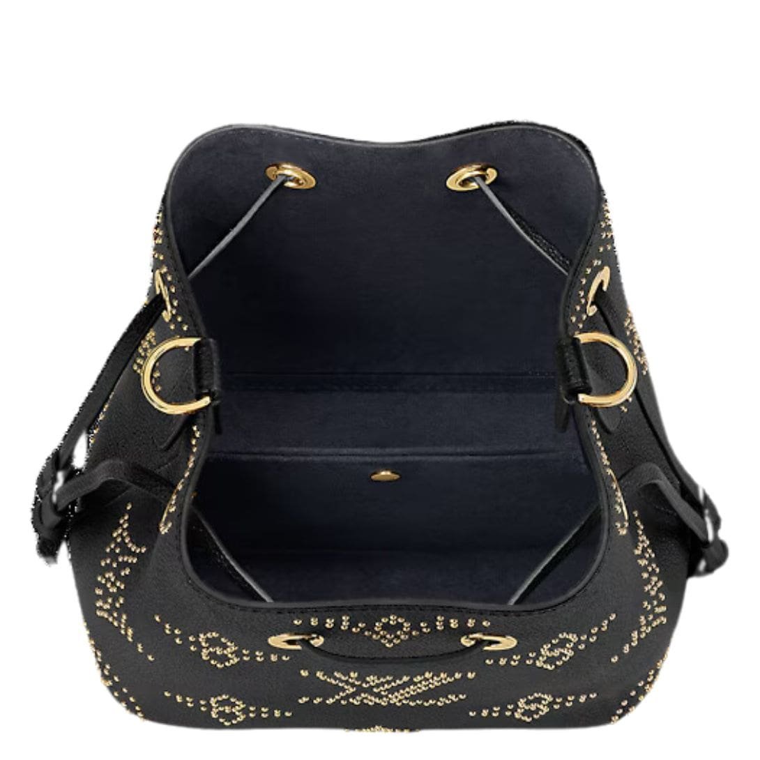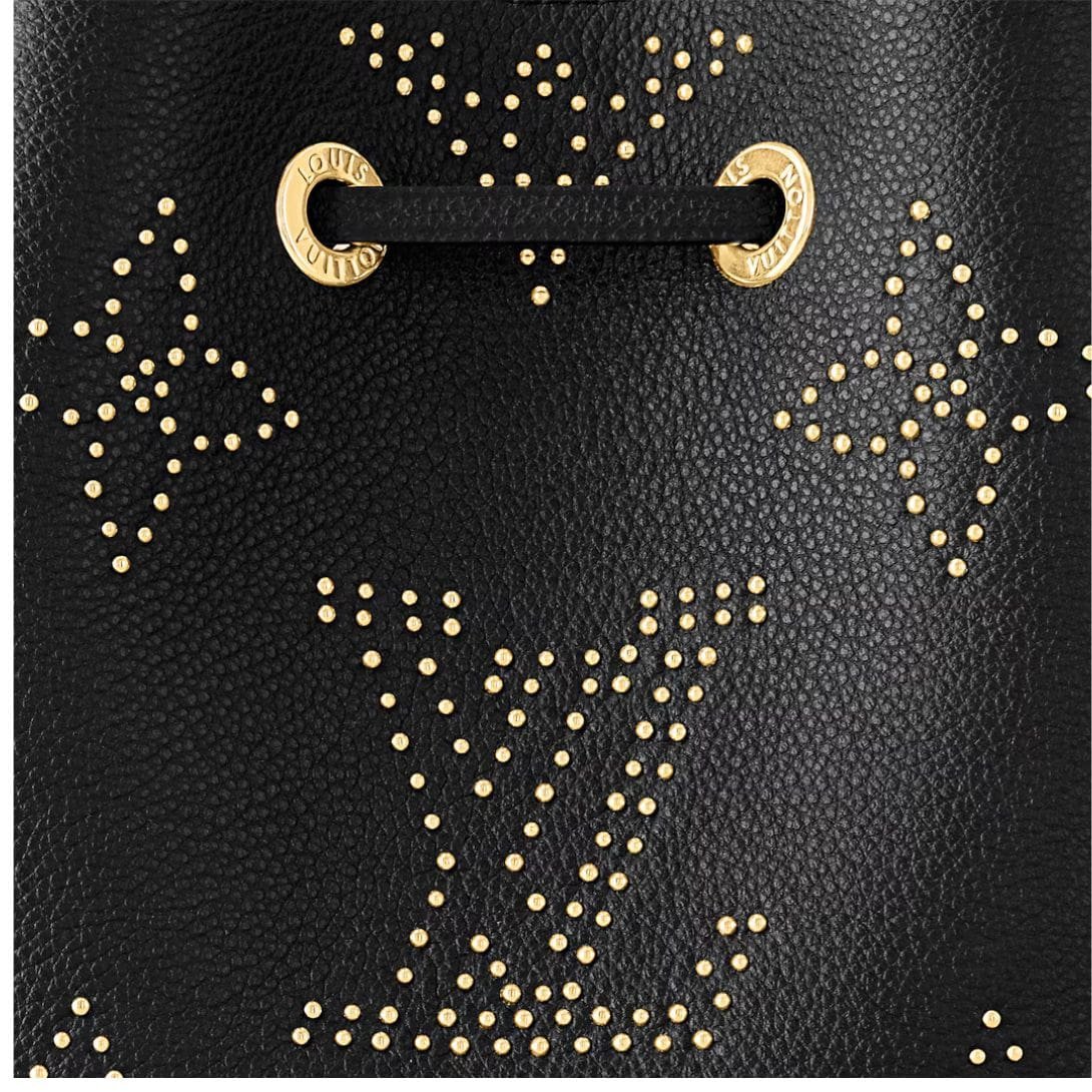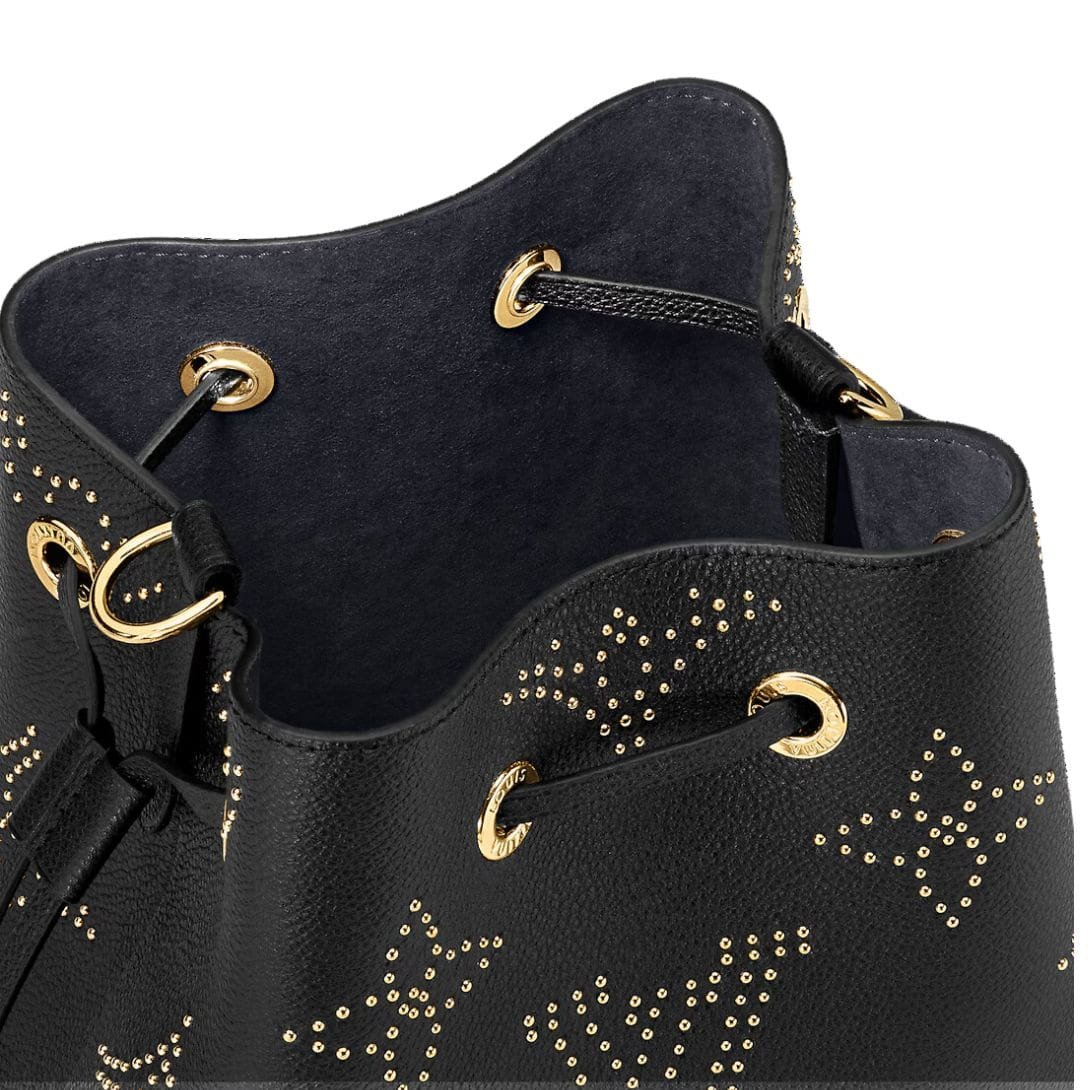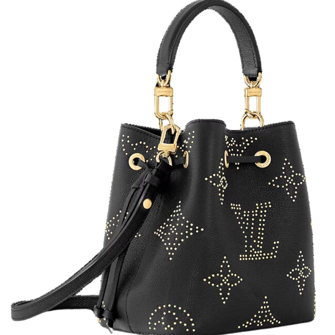 Meet the LOUIS VUITTON NEONOE BB. bucket bag, a sleek rendition of sophistication and edge. Crafted from Monogram Empreinte leather, this compact masterpiece features a striking version of the Monogram pattern, meticulously formed with studs, each coated with 0.25 microns of luxurious gold. Sized perfectly for your essentials like phone, keys, and wallet, it stands at 7.9 x 7.9 x 5.1 inches, making it an ideal companion for any occasion.