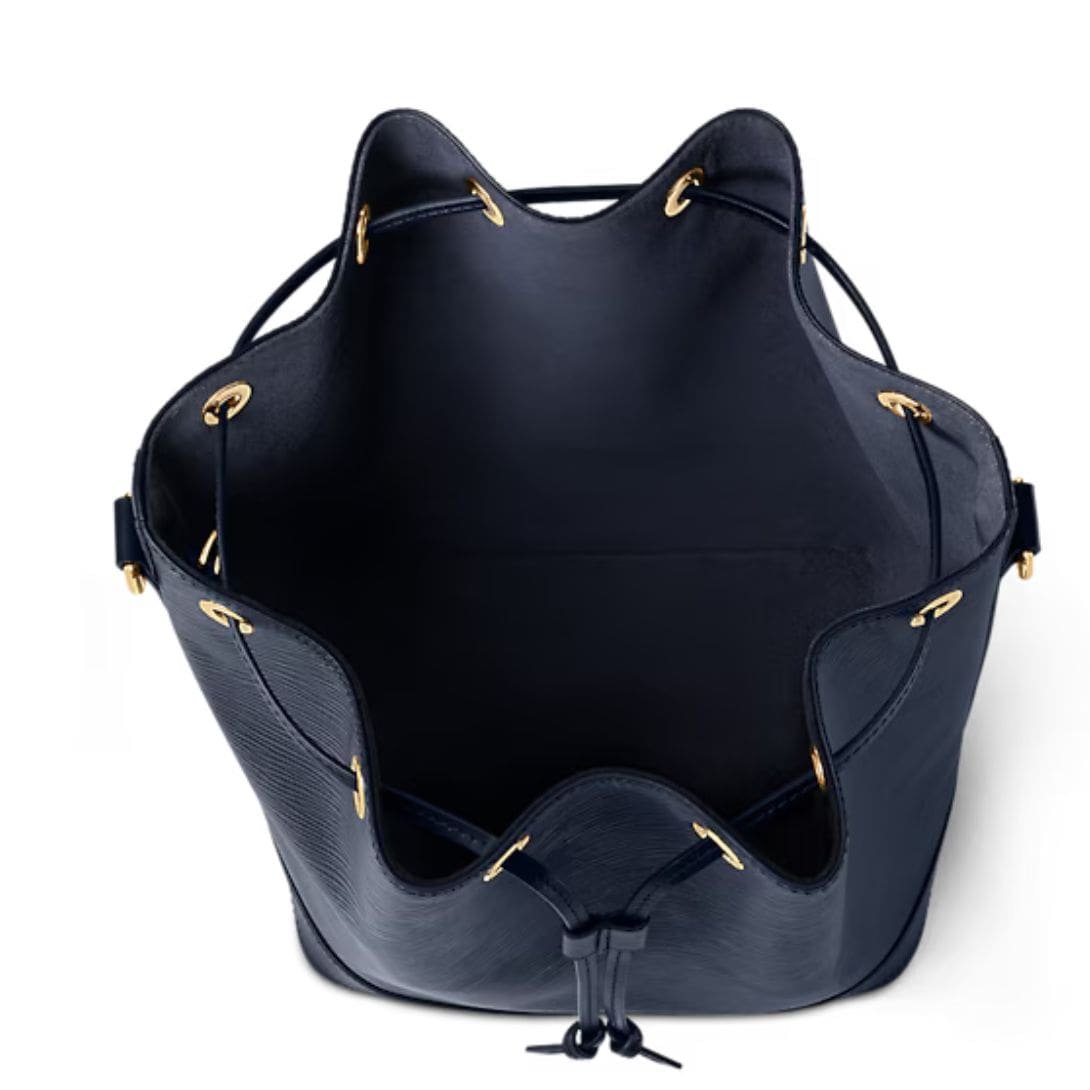 Measuring at 10.6 x 13 x 7.9 inches (length x height x width), the LOUIS VUITTON NOE MM offers ample space to accommodate your everyday essentials. Its navy blue hue exudes sophistication, while smooth cowhide-leather trim and gold-color hardware add a touch of refinement to its aesthetic.