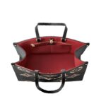 Measuring 16.1 x 13.4 x 7.5 inches, this spacious carryall boasts a striking black and beige colorway, complemented by supple-grained cowhide-leather trim and gold-color hardware. The microfiber lining in red adds a pop of color to the interior, while the hook closure ensures security.