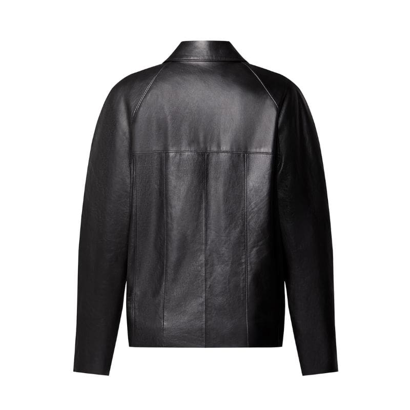 Crafted from premium materials, the jacket boasts a luxurious composition of 95% lambskin and 5% calfskin, ensuring both durability and softness against the skin. The smooth black lambskin forms the main body of the jacket, providing a sleek and sophisticated backdrop for the intricate detailing that adorns the front.