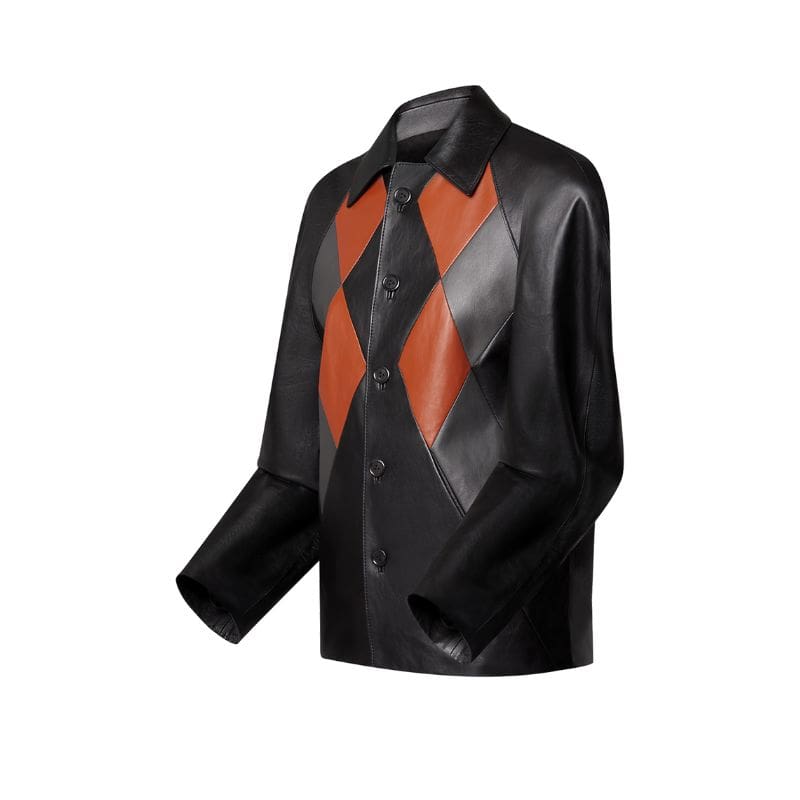 The standout feature of this jacket is its colorful patchwork of diamond-shaped calfskin inserts, which adorn the front with a vibrant and eye-catching pattern. This patchwork design adds a playful yet understated retro feel to the jacket, injecting personality and character into its overall aesthetic.