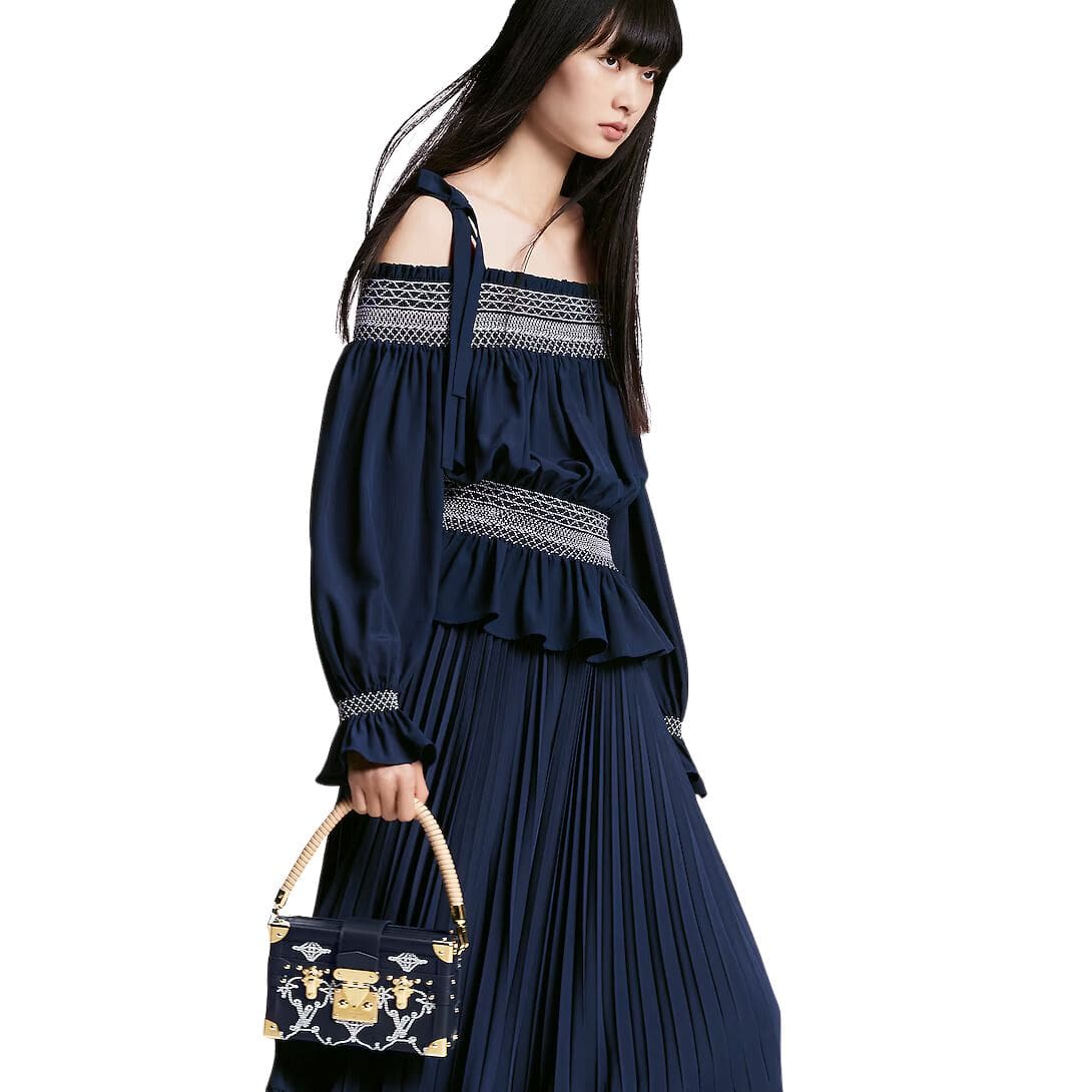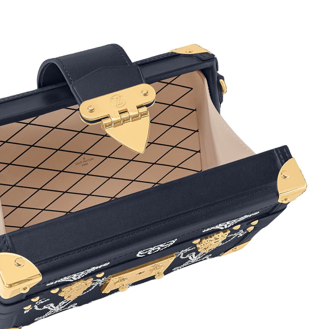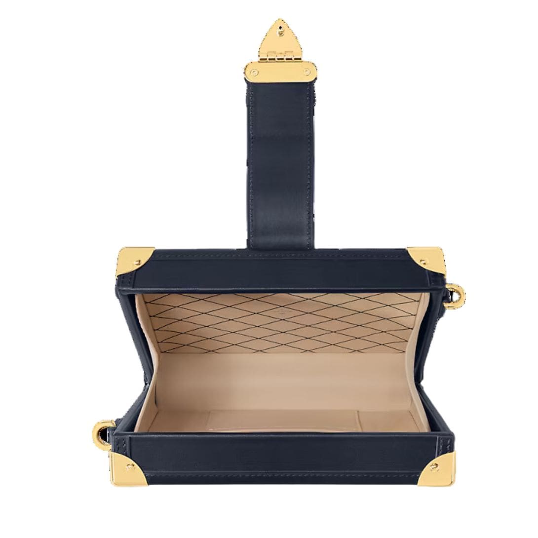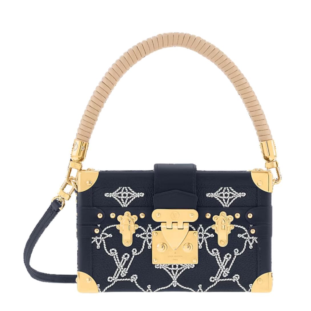 The Petite Malle is designed with versatility in mind, featuring a twisted leather handle for handheld carry and a removable and adjustable shoulder strap for crossbody wear. The gold-color hardware adds a luxurious finishing touch to the ensemble.