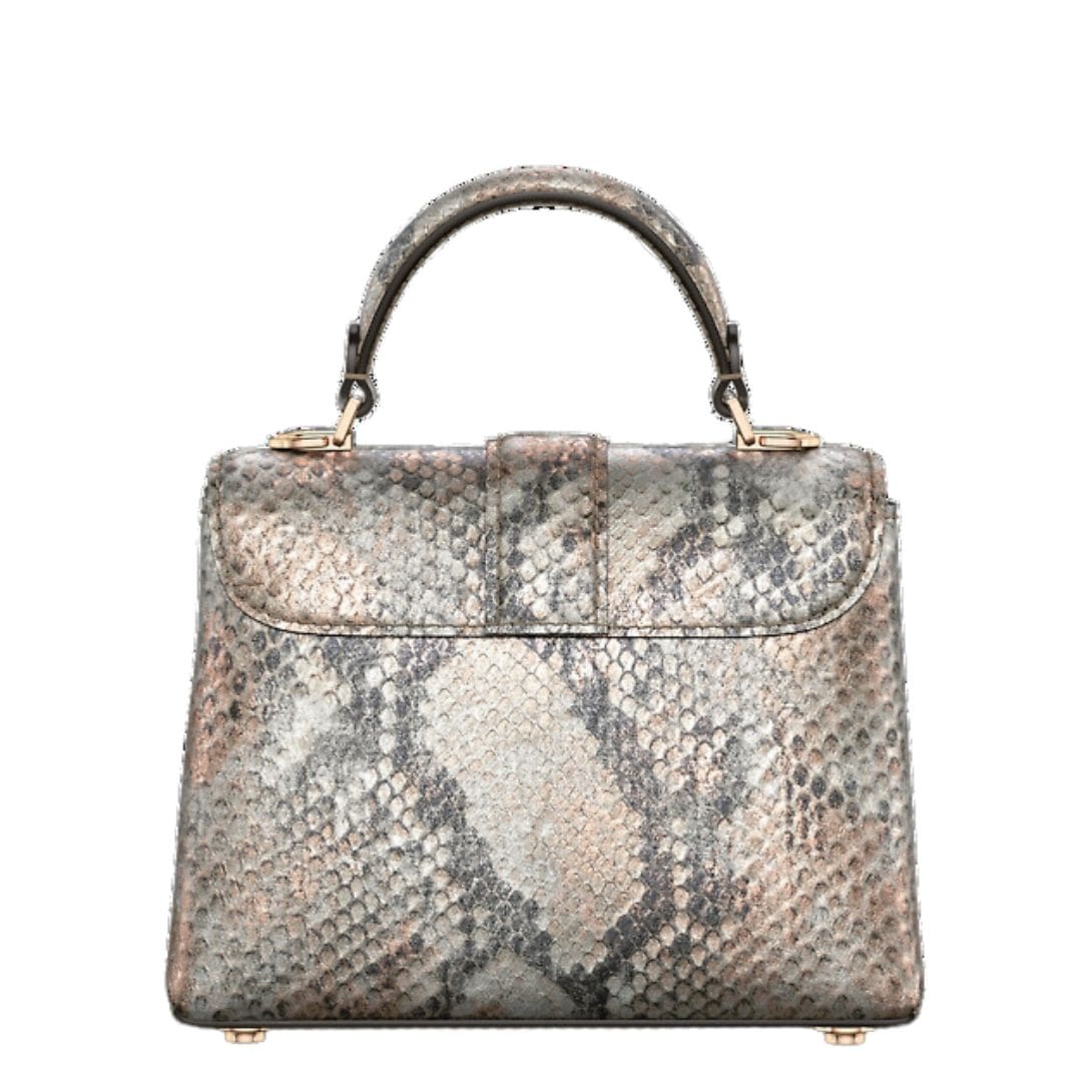 Boasting python leather construction with delicate python trim and a sumptuous goatskin lining, this handbag is adorned with exquisite pink gold hardware, adding a touch of refinement to its allure. The versatile design offers multiple carrying options, with a chic python leather strap for shoulder or crossbody wear, alongside a convenient top handle for effortless elegance.