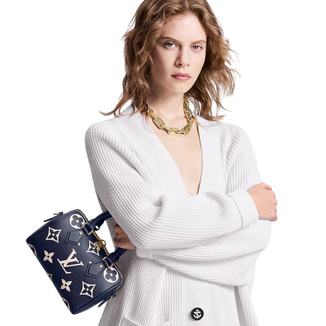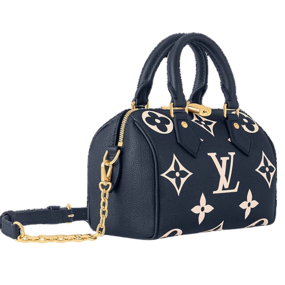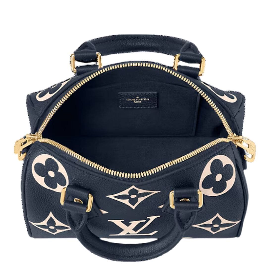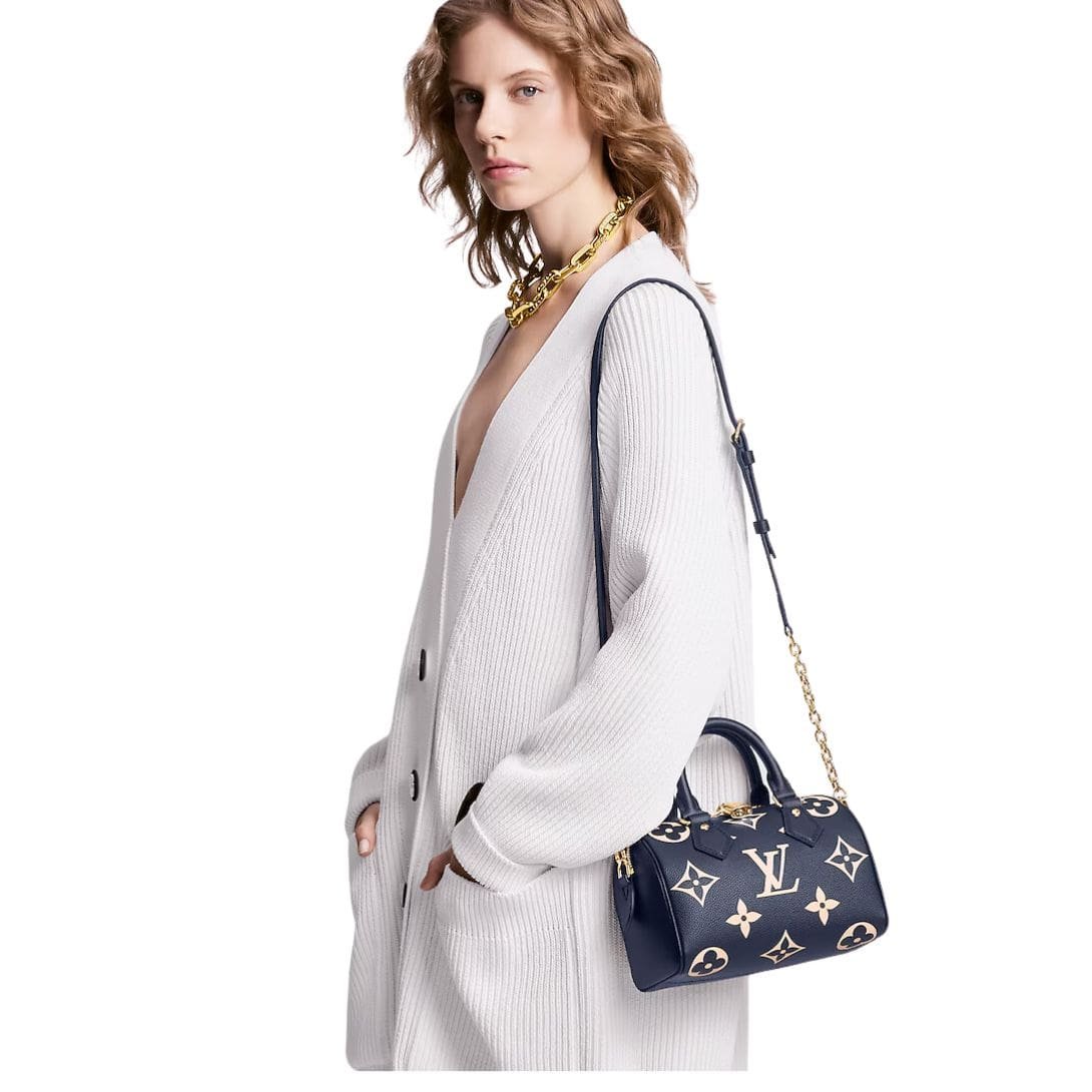 Introducing the LOUIS VUITTON SPEEDY BANDOULIERE 20 , a timeless icon elevated with the luxurious allure of two-color Monogram Empreinte cowhide leather. Crafted as part of the Nautical Collection, this sophisticated bag features a striking navy-blue base adorned with cream Monogram embossing, creating a captivating visual contrast. Measuring 8.1 x 5.3 x 4.7 inches (length x height x width), the Speedy Bandoulière 20 offers a compact yet spacious design suitable for everyday essentials.