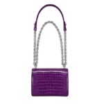 Measuring 7.5 x 5.9 x 3.5 inches, the LOUIS VUITTON TWIST PM CHAIN is meticulously designed to offer both style and functionality. Its amethyst purple hue exudes opulence, perfectly complemented by brilliant alligator leather trim and silver-color hardware accents, creating a striking visual statement.