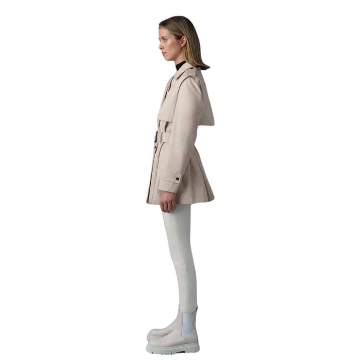 The Mackage Adva Mid-Length Buckled Belt Trench is a mid-length trench coat made from a cotton-blend twill. It features a wide notched lapel, epaulette shoulders, and rainshedder detailing for classic styling. The semi-fitted silhouette is accentuated by a removable belt and a pleated peplum, offering a touch of luxury to this timeless piece.