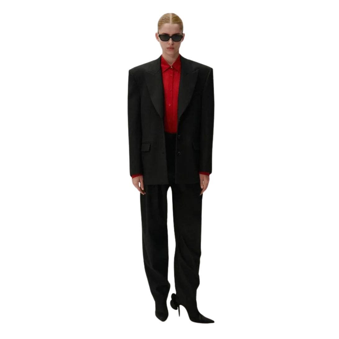 In conclusion, Magda Butrym’s signature oversized blazer in black wool is a masterful blend of classic and contemporary elements. Its strong shoulders and boyfriend fit create a chic and modern look, while the luxurious black wool fabric ensures it remains a timeless tailoring staple. This blazer is a versatile and sophisticated piece that can effortlessly elevate any outfit, making it an indispensable addition to any fashion-forward wardrobe.