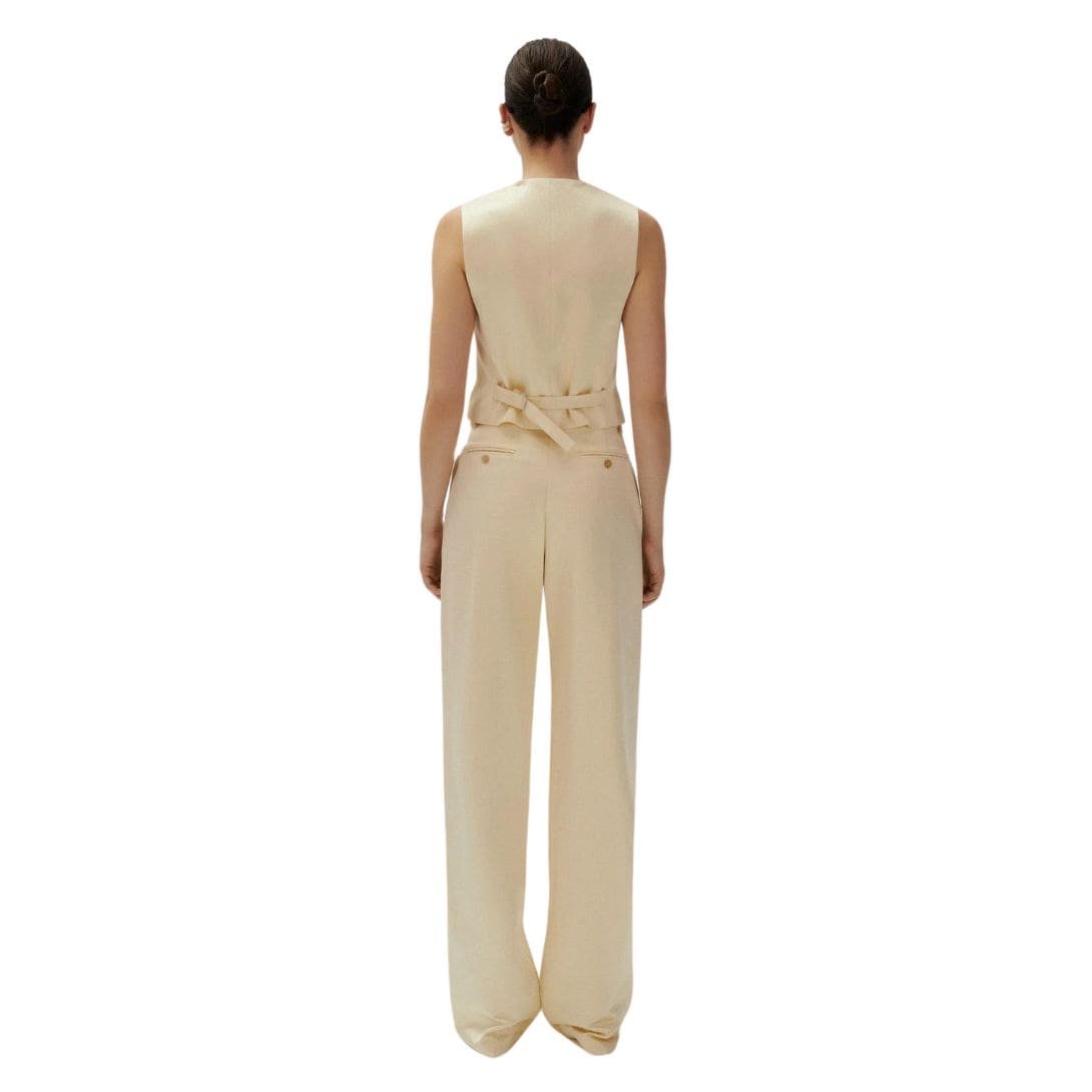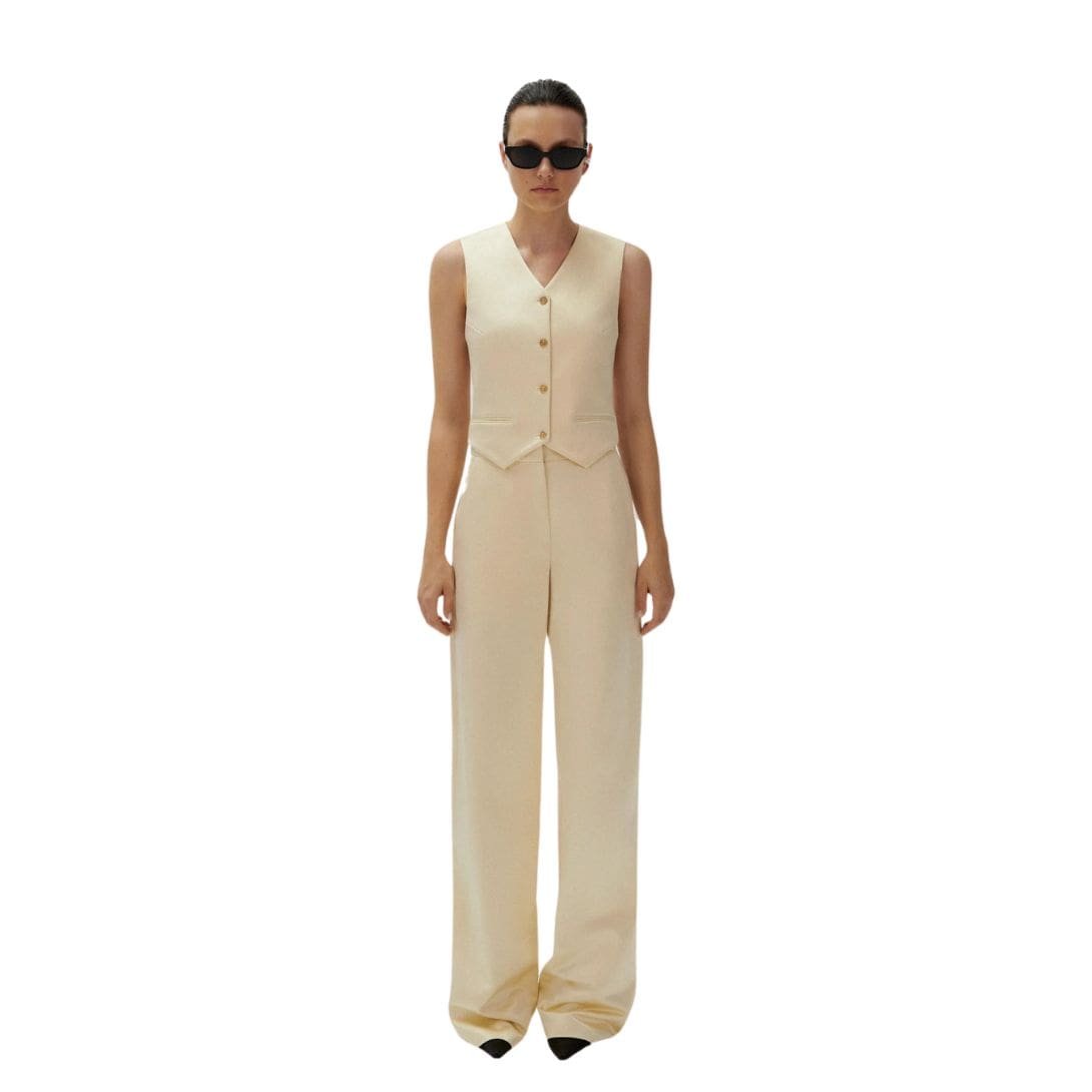 The MAGDA BUTRYM CLASSIC WAISTCOAT IN YELLOW stands as an emblem of timeless tailoring, embodying sophistication and refinement. Magda Butrym’s interpretation of this iconic garment pays homage to its traditional roots while infusing it with contemporary flair, making it a versatile addition to any wardrobe.
