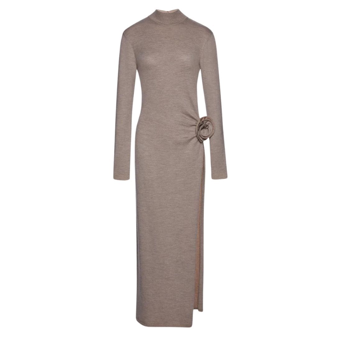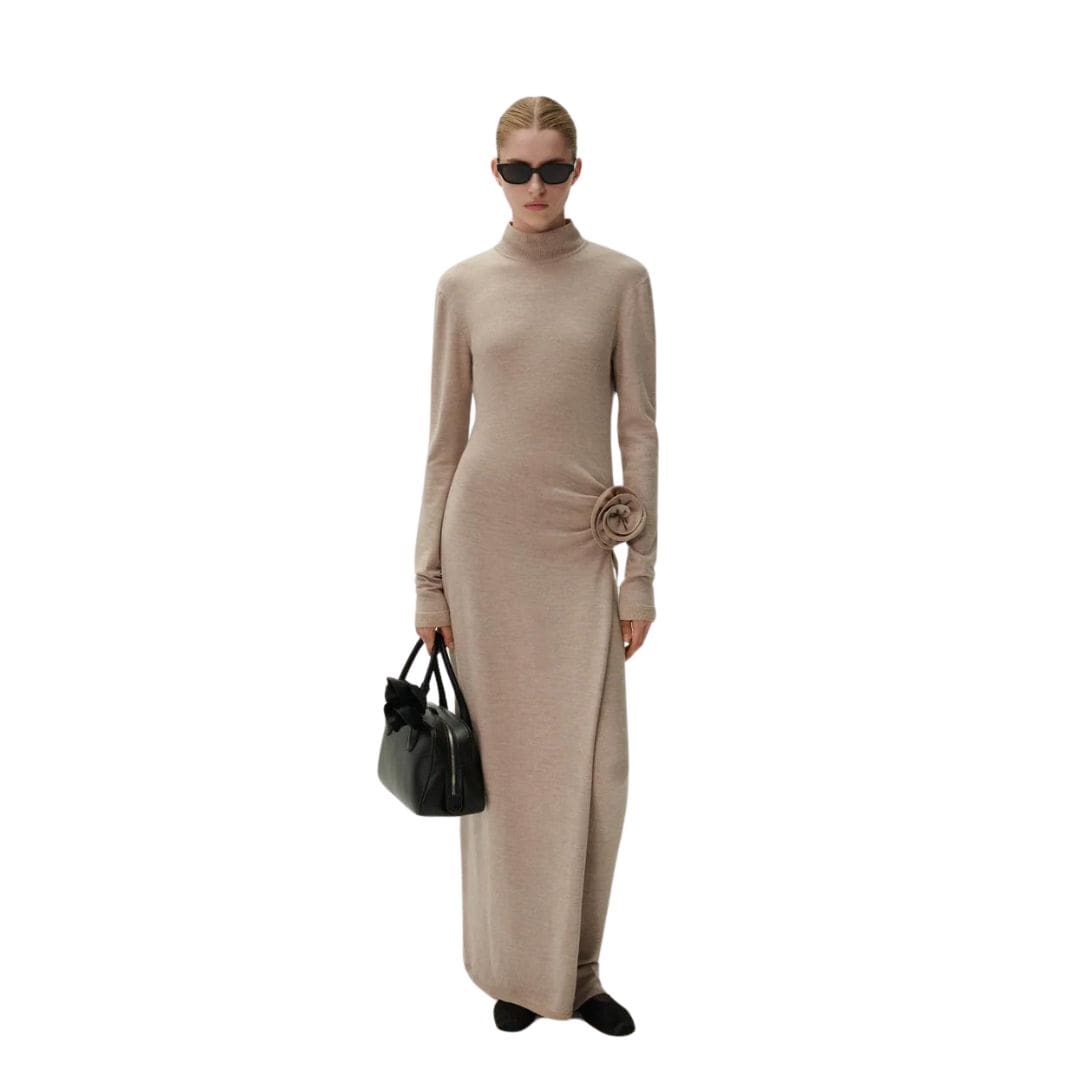 Magda Butrym high neck knit maxi dress in beige exudes refined elegance, featuring a sophisticated silhouette with long sleeves and a side-slit skirt. The dress is gathered at the hip, enhancing the figure, and adorned with intricate 3D flower appliqués for a touch of artistic detail.