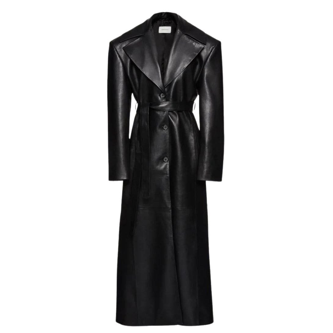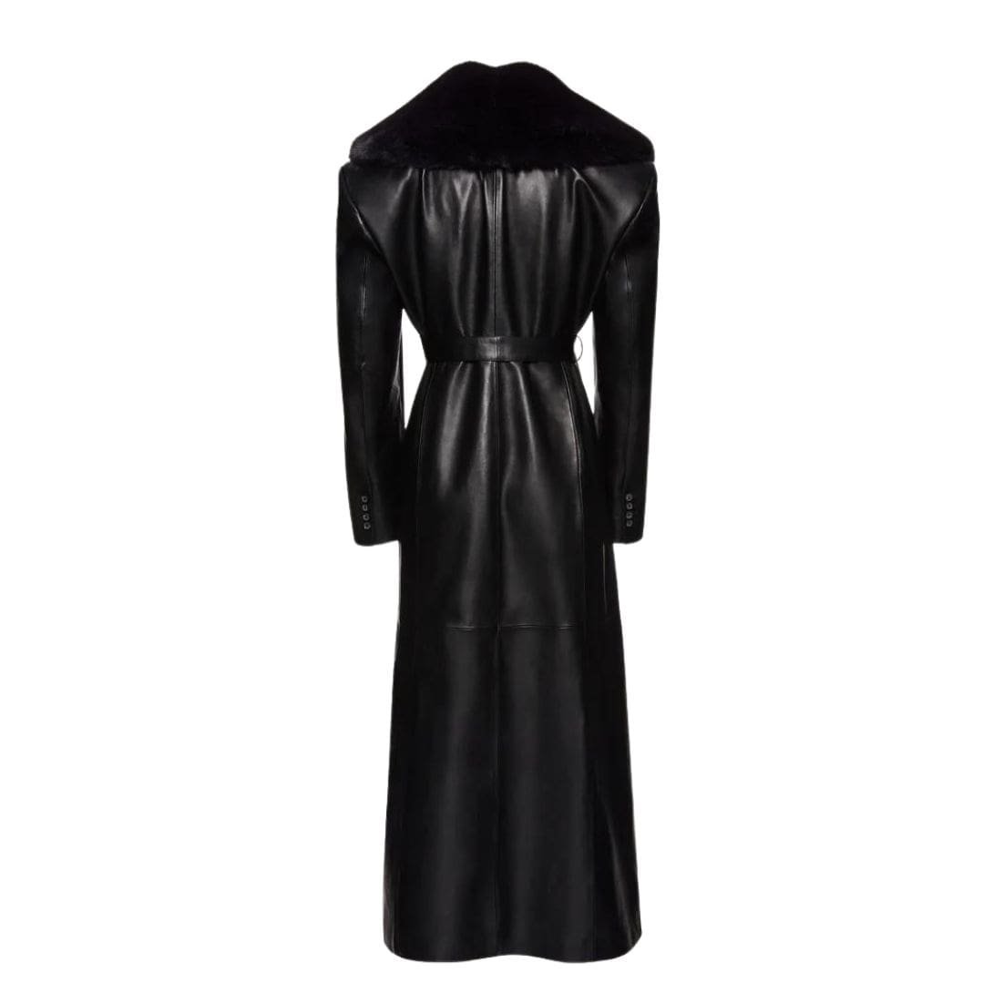 The long length of the coat adds to its dramatic appeal, creating a sleek and elongating effect. This makes it an ideal choice for both formal and casual occasions, seamlessly transitioning from day to night. The black leather provides a timeless and versatile base that can be easily paired with a variety of outfits, from tailored trousers and skirts to casual jeans and boots.