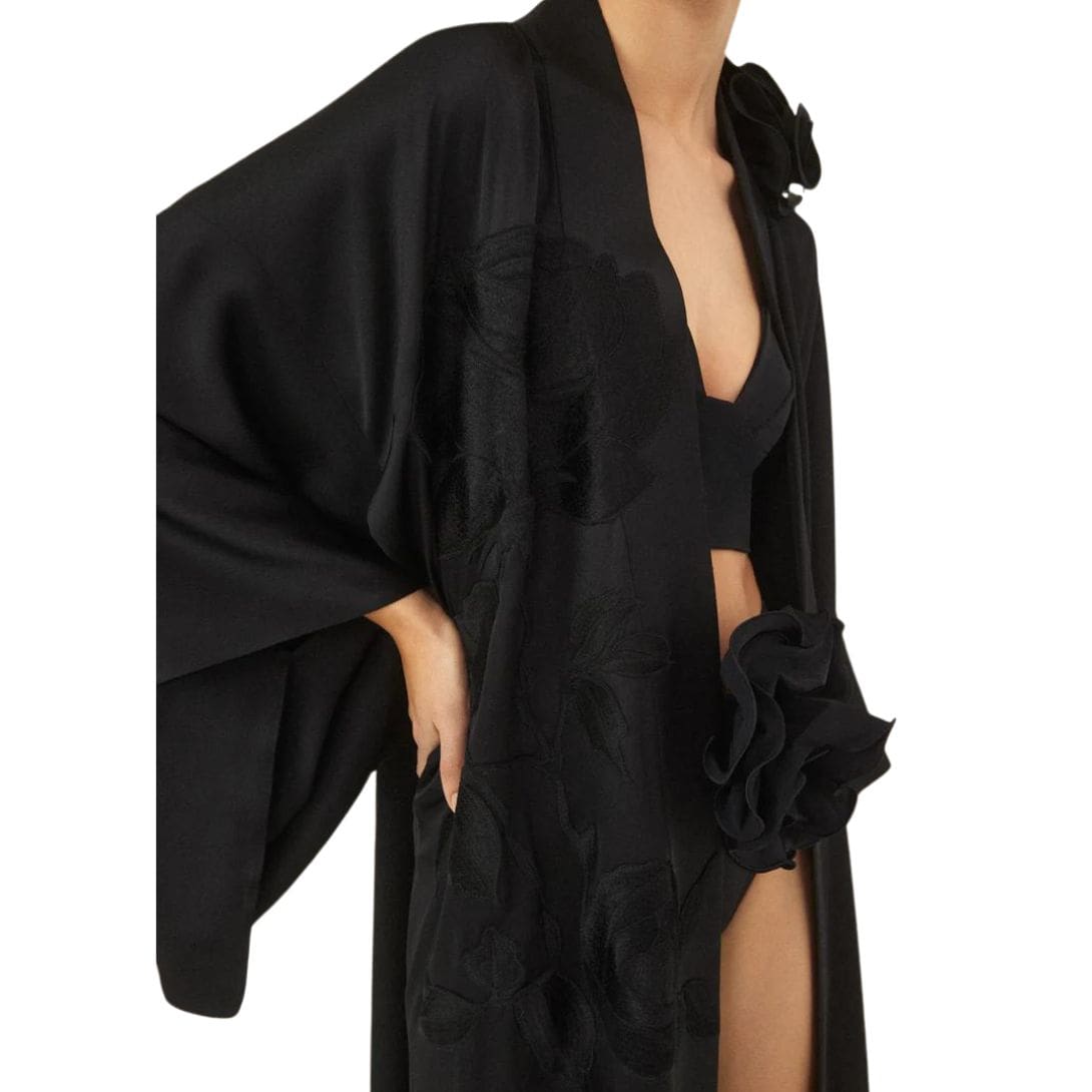 In summary, the Magda Butrym Silk Embroidered Kimono in Black is a true embodiment of luxury and femininity. From its hand-embroidered floral design to its detachable silk flower brooch, every detail of this kimono reflects the brand’s commitment to craftsmanship and elegance. Whether worn as intimate apparel or outerwear, this kimono is sure to make a statement and leave a lasting impression.