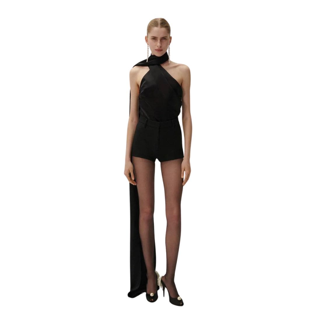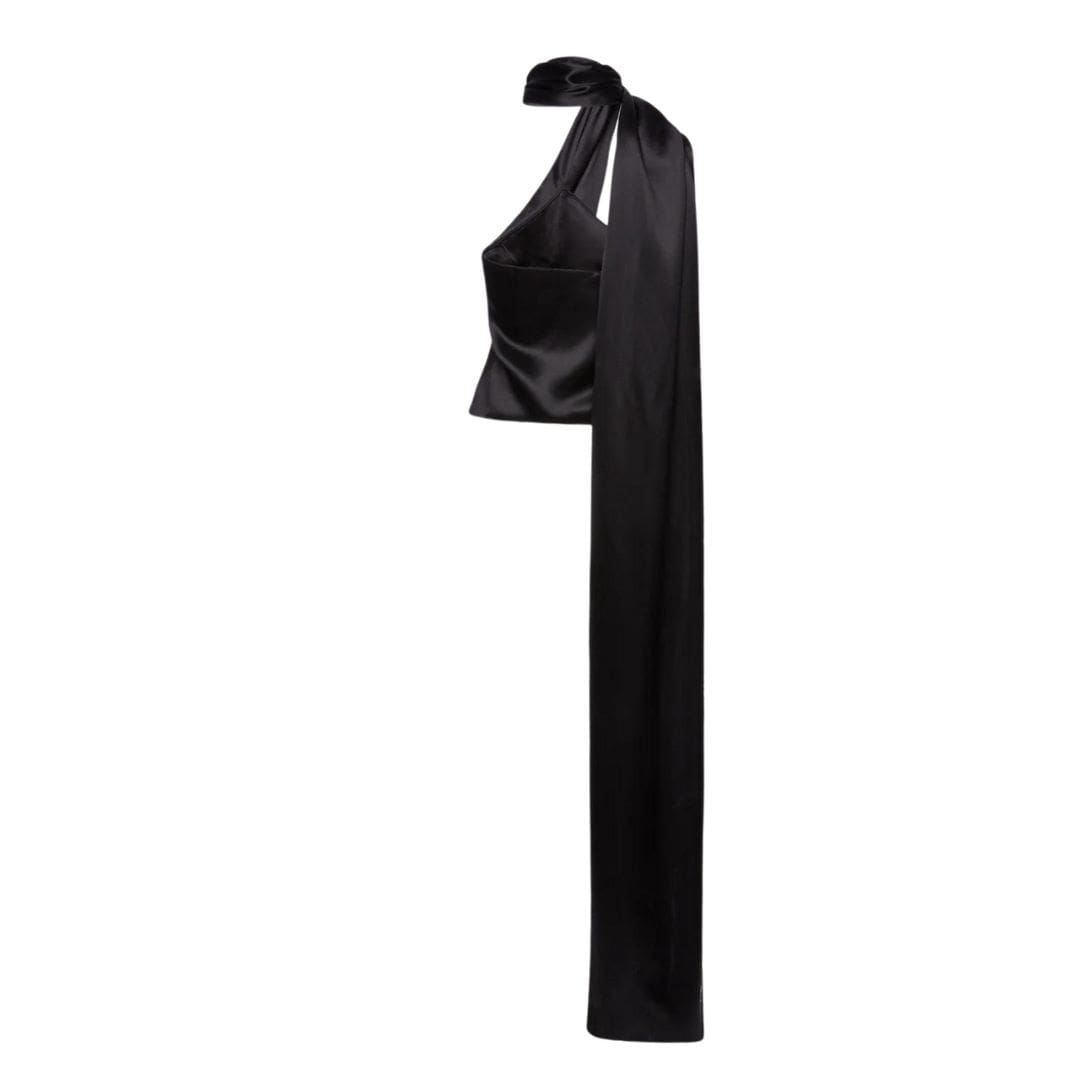This season’s essential piece from Magda Butrym silk wrap neck top in black detail that evokes a glamorous scarf effect, complemented by a long sash for added drama. Crafted from jersey fabric, this tank top combines comfort with elevated style through its intricate wrap detailing along the body.