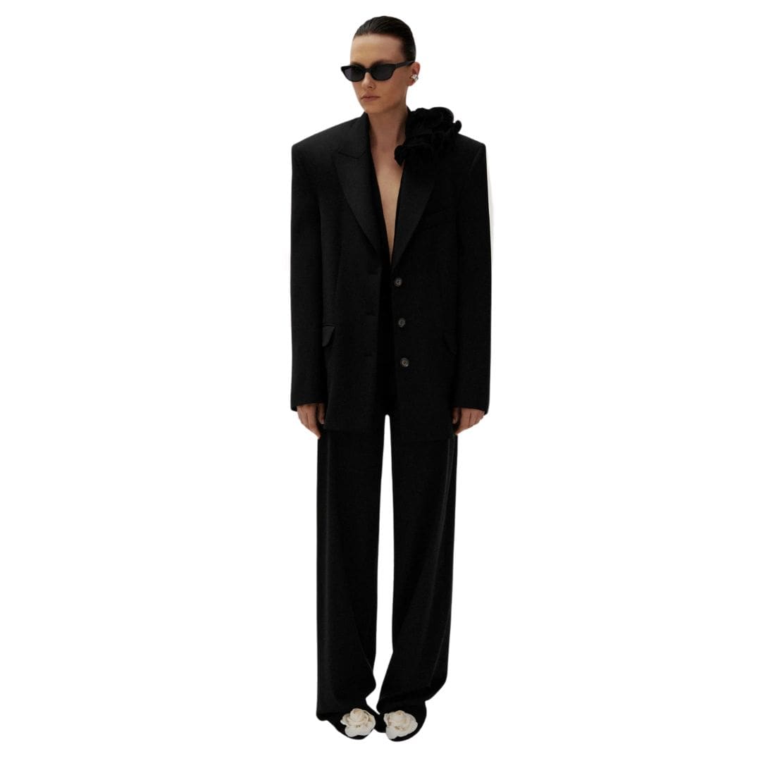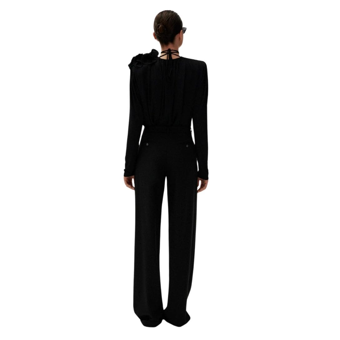 In conclusion, MAGDA BUTRYM WIDE-LEG WOOL TROUSERS IN BLACK is a classic piece of tailoring that exudes sophistication and refinement. With their high waist, back pockets with horn button closure, front and back pleats, and belt loops, they offer a perfect blend of timeless charm and modern elegance. Crafted with meticulous attention to detail and quality craftsmanship, these trousers are sure to become a wardrobe staple for any discerning fashion enthusiast.