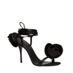 These flowers are meticulously crafted with attention to detail, featuring lifelike petals that create a natural, delicate appearance. The deep black hue of the flowers harmonizes beautifully with the black satin, resulting in a cohesive and sophisticated look. The combination of luxurious materials, intricate design, and charming floral embellishments makes these sandals a true statement piece.