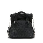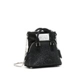 Crafted in Italy, Maison Margiela 5AC Cinema inferno baby crossbody bag introduces the iconic handbag silhouette in a captivating black iteration for AW23, adorned with sparkling Swarovski crystal embellishments and signature house motifs. The numerical logo patch at the front adds a distinctive touch. This 5AC Cinema Inferno boasts a main compartment accessible through a convenient zip fastening, offering ample storage space. Versatile in its wear, it can be carried across the body, on the shoulder, or handheld, thanks to its detachable chain-link strap and two rolled top handles. The silk trim adds a luxurious accent to its design, while hand-painted elements contribute to its unique aesthetic. Finished with metal feet for added protection, an internal logo stamp, and silver-tone hardware, this accessory exudes both opulence and functionality.