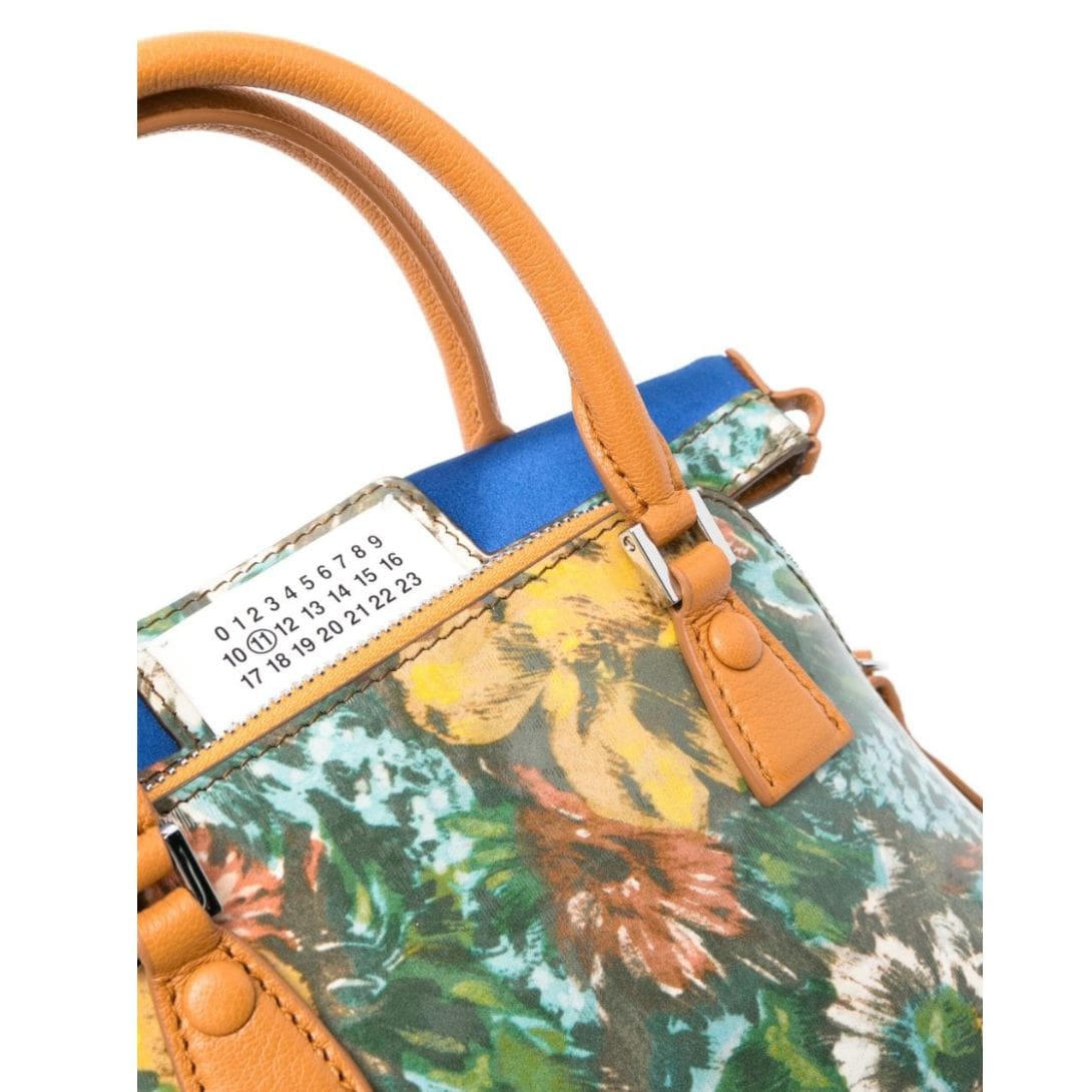 Maison Margiela 5AC Classique Micro Bag, Crafted in Italy, Maison Margiela introduces the 5AC Classique Micro bag in camel brown with a captivating multicolor floral print. Made from calf leather with a coated finish, it features a unique layered design for added depth. The bag is equipped with two rolled top handles and a leather and chain-link shoulder strap for versatile carrying options. Adorned with the brand’s signature four-stitch logo and signature numbers motif pattern, it includes an internal slip pocket and logo patch for the organization. The bag is finished with metal feet for protection and secured with a concealed press-stud fastening.
