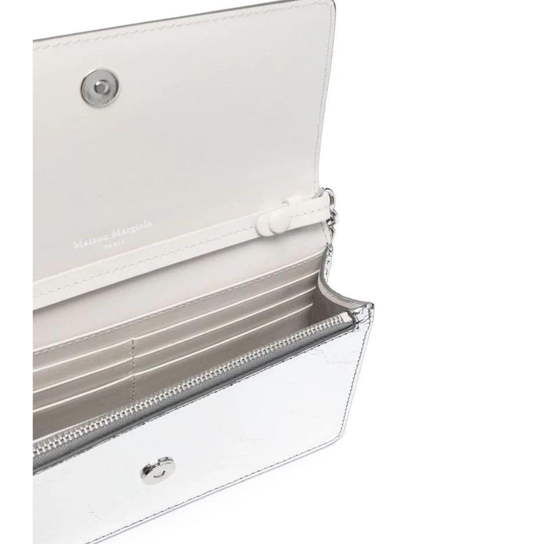 Introducing the Maison Margiela Broken Mirror wallet-on-chain, a symbol of modern elegance crafted in Italy. Its shimmering silver-tone exterior, made from luxurious calf leather, captures attention with its metallic finish. The foldover top design adds a touch of sophistication, concealing internal card slots for practical organization.