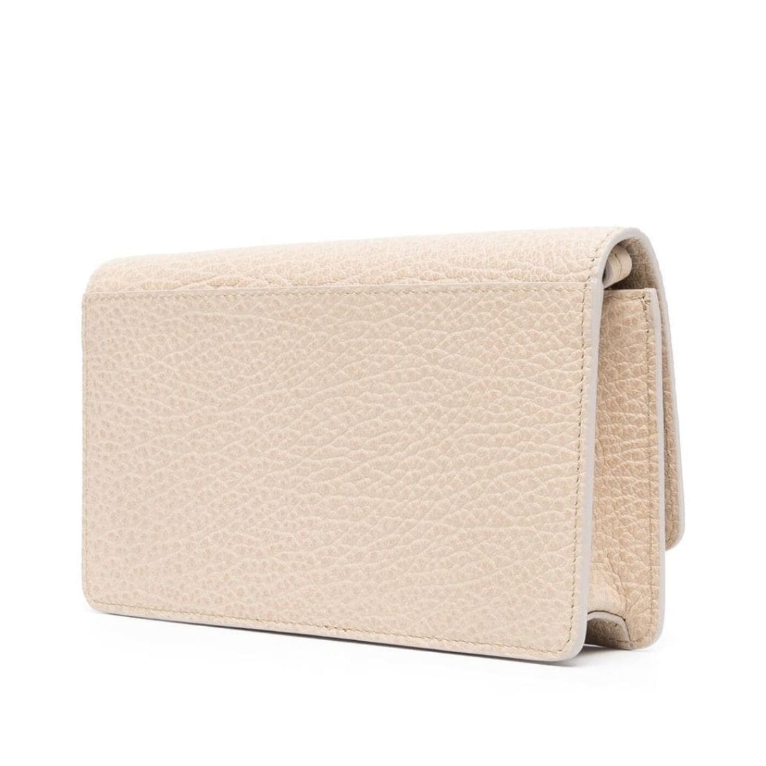 Maison Margiela Four-Stitch Leather Wallet-on-Chain, Crafted in Italy, this wallet-on-chain by Maison Margiela features a sleek design in beige calf leather, adorned with the signature four-stitch logo. It comes with gold-tone hardware, a detachable chain-link shoulder strap, and a foldover top with press-stud fastening.
