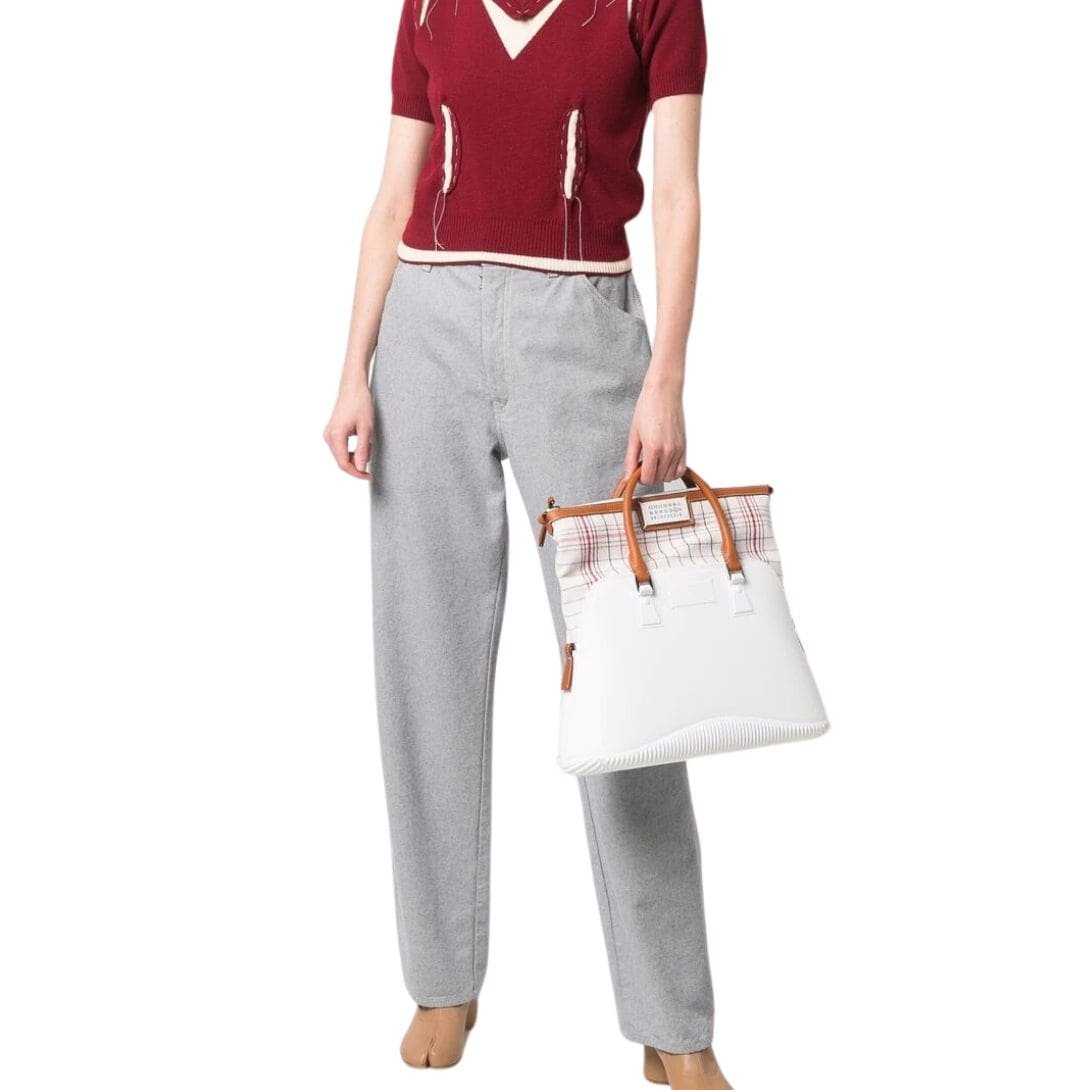 Description: A staple of the brand, Maison Margiela large 5AC top-handle bag bag showcases the label’s deconstructed approach to design. Crafted from smooth calf leather, this SS22 iteration features a check pattern decorating the signature folded edge.