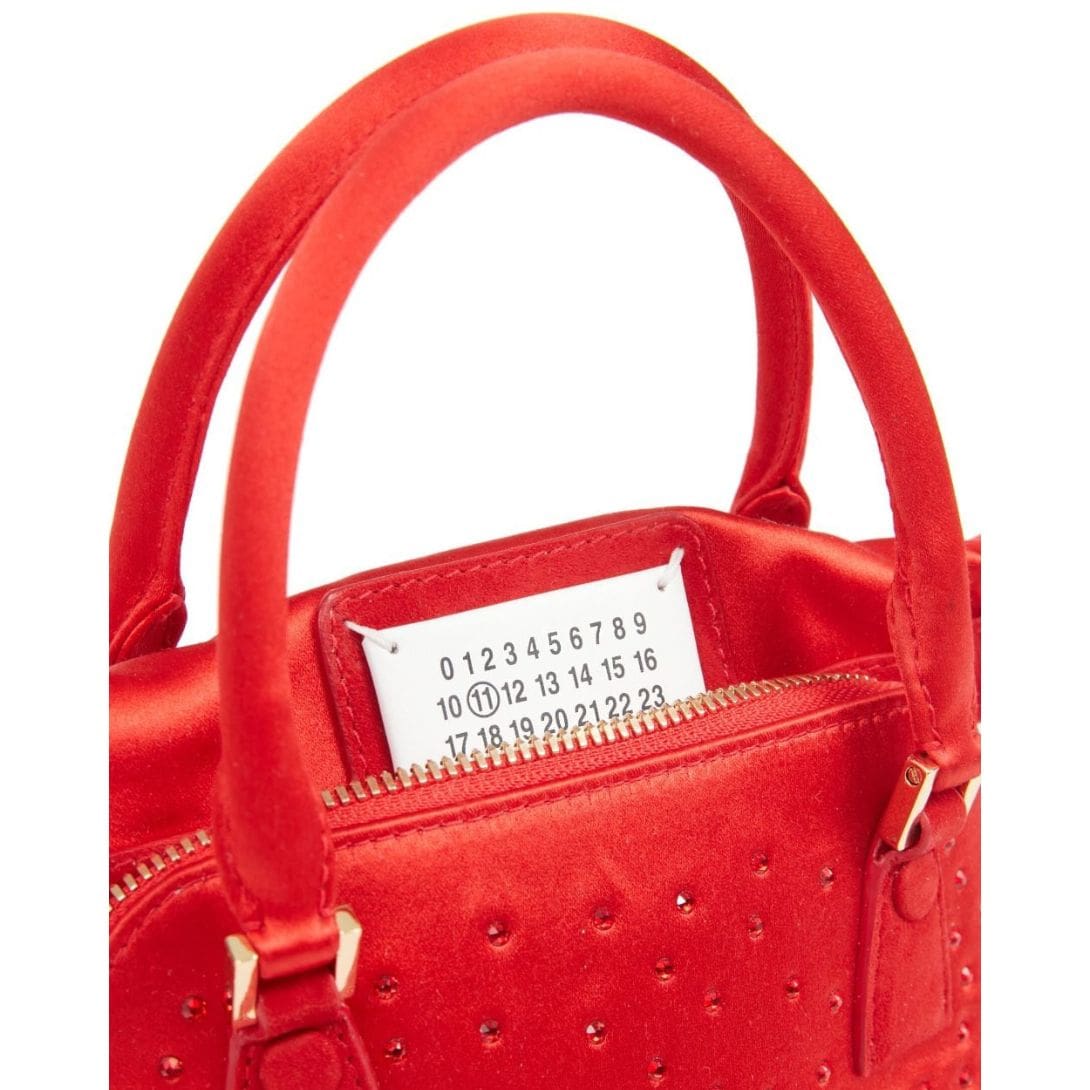 Introducing the MAISON MARGIELA micro 5AC Cinema Inferno crossbody bag, meticulously crafted in Italy. This striking accessory comes in a vibrant poppy red hue, accentuated by the signature numbers motif and dazzling rhinestone embellishments.