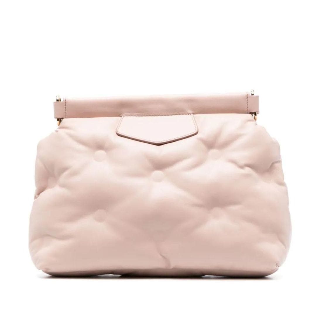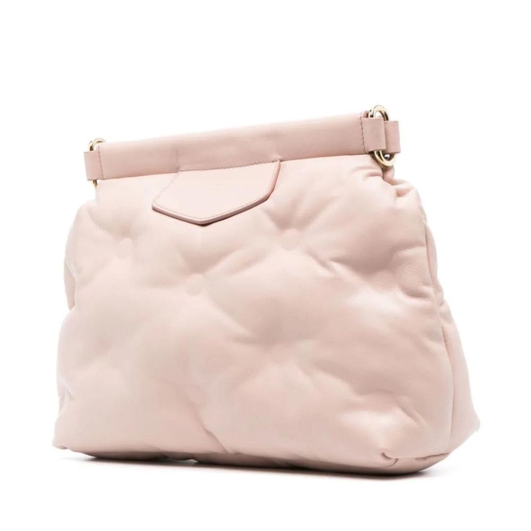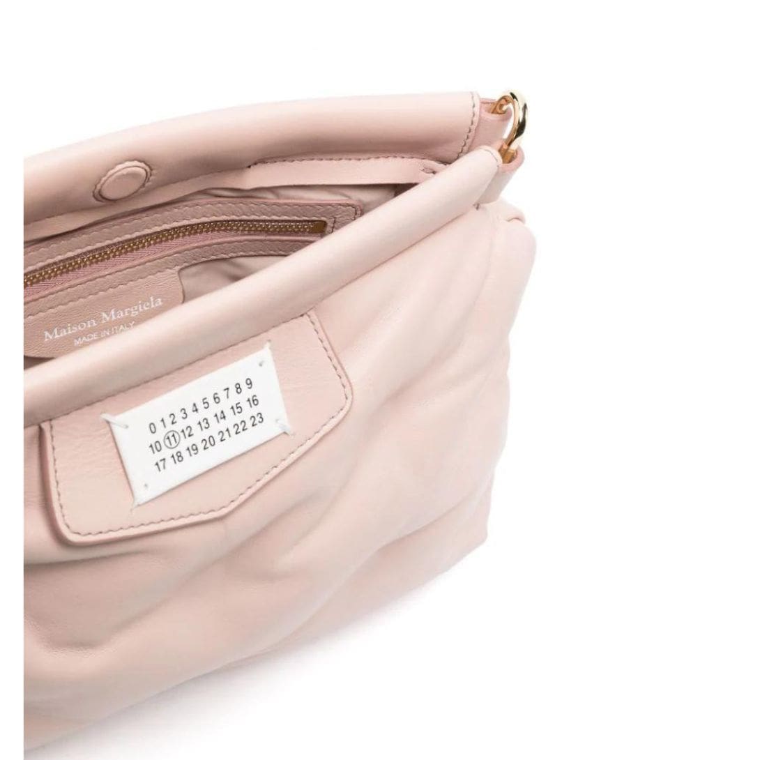 Maison Margiela Small Glam Slam Classique Shoulder Bag, Crafted in Italy, Maison Margiela introduces the small Glam Slam Classique shoulder bag. Its delicate powder pink hue and smooth grain sheepskin exude elegance. Adorned with the brand’s signature numbers motif and complemented by gold-tone hardware, this bag offers a touch of luxury. It comes with an adjustable detachable shoulder strap for versatile wear and a concealed magnetic fastening for security. The main compartment includes an internal zip-fastening pocket for organization.