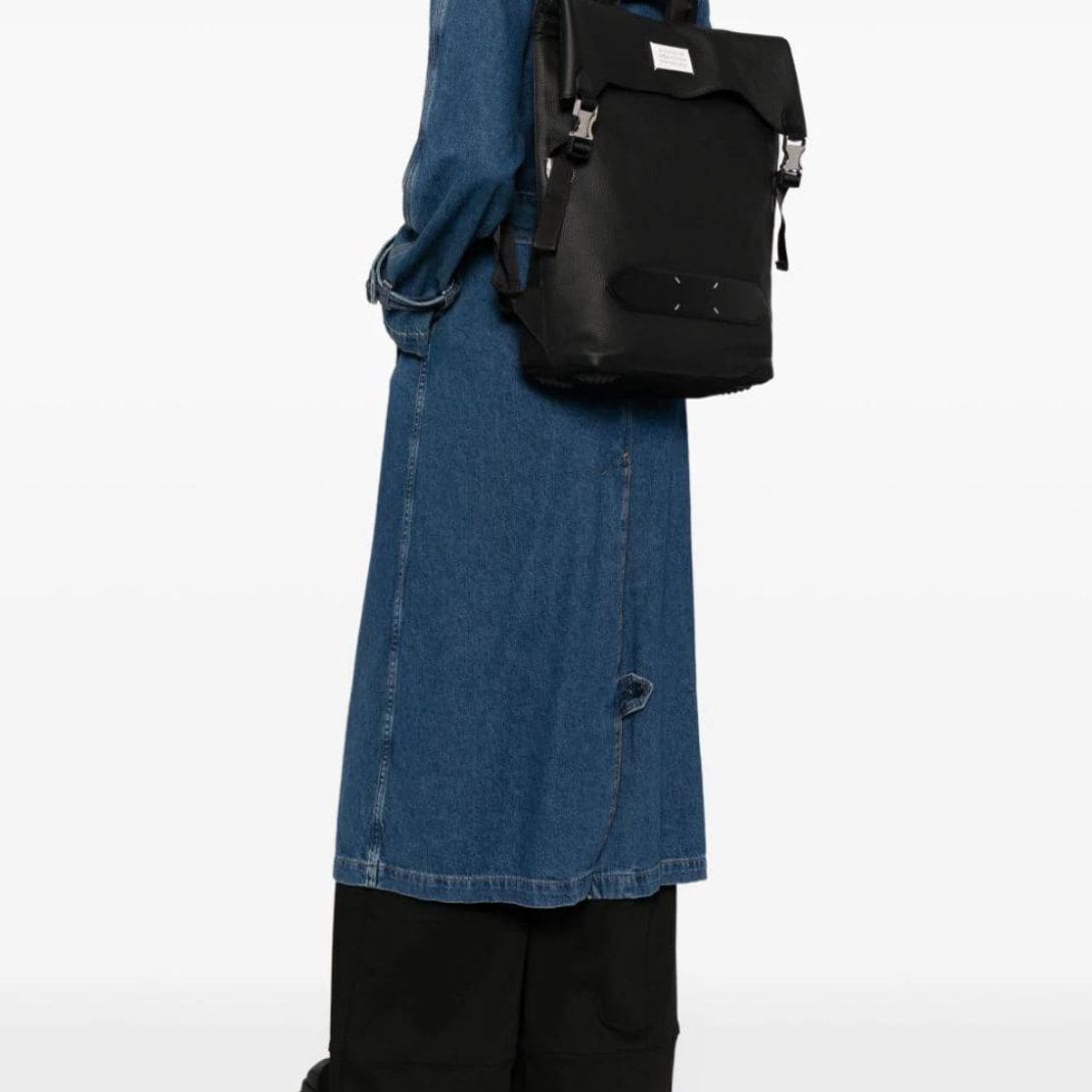 This backpack embodies Maison Margiela’s signature blend of luxury and minimalist design, featuring high-quality calf leather with a grained texture and iconic branding elements. It offers practicality with its adjustable straps and spacious main compartment, making it suitable for various occasions.