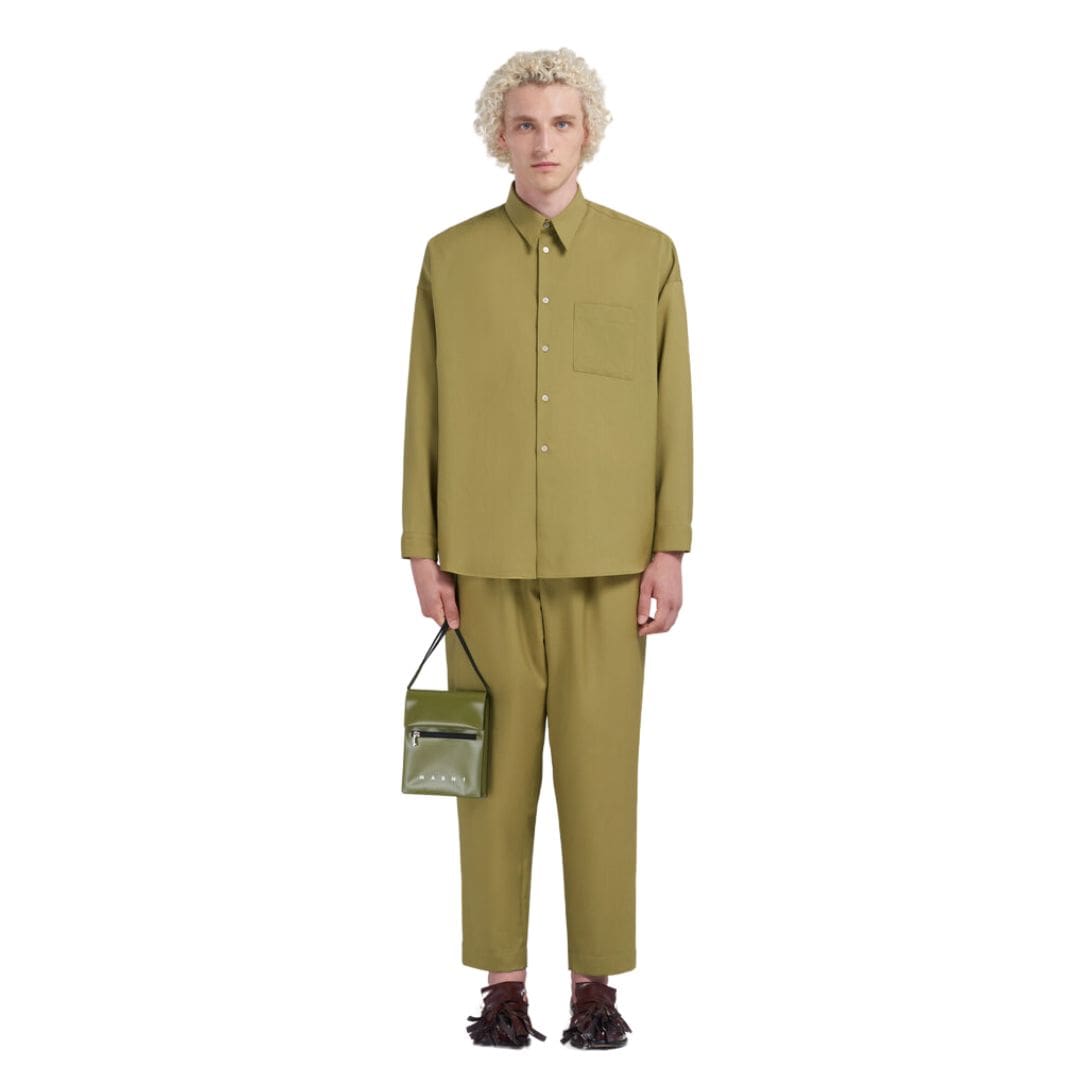 Marni Green Pouch with Shoelace Strap embodies a unique blend of style and functionality. Marni, renowned for its innovative approach to fashion, has outdone itself with this accessory. The pouch features a vibrant green hue that stands out effortlessly, adding a pop of color to any outfit. The shade is bold yet versatile, perfect for those who want to make a statement without overwhelming their ensemble.