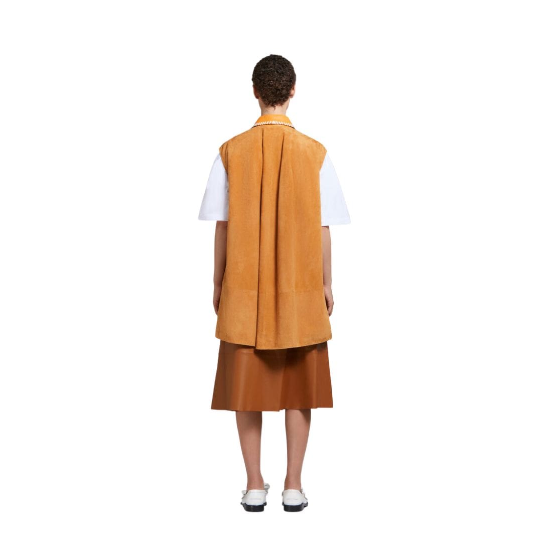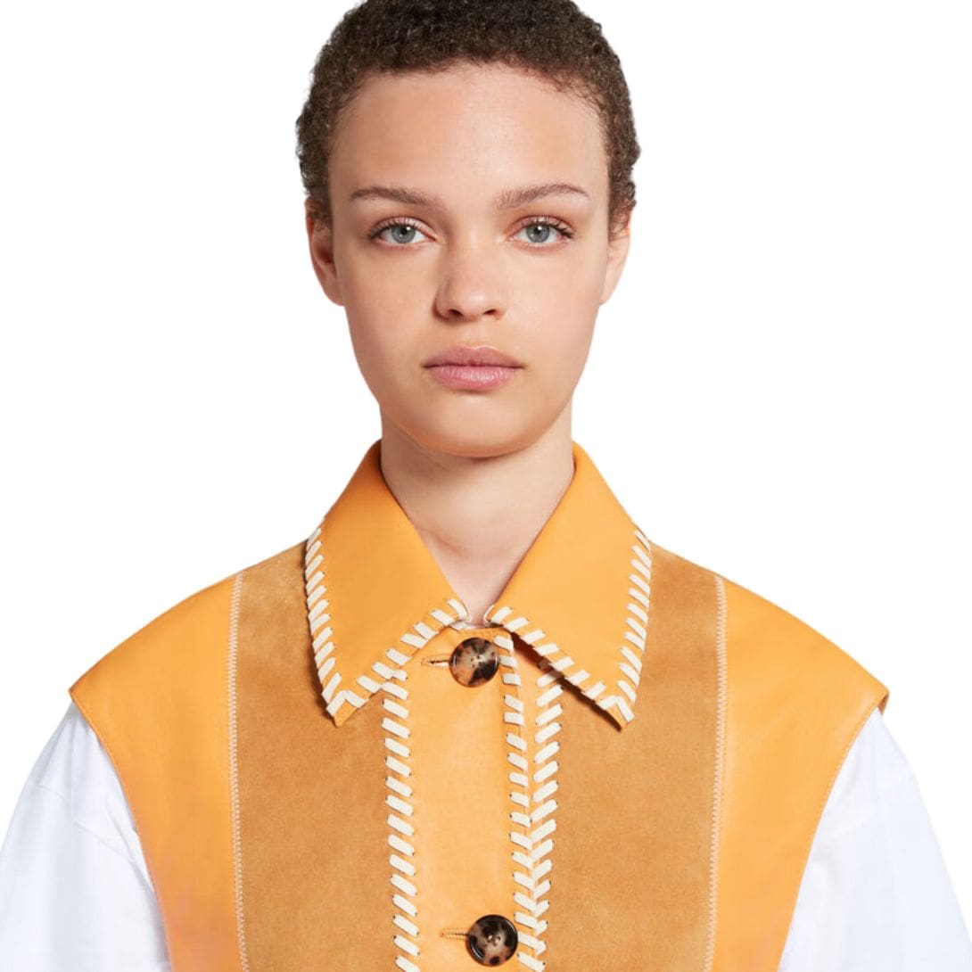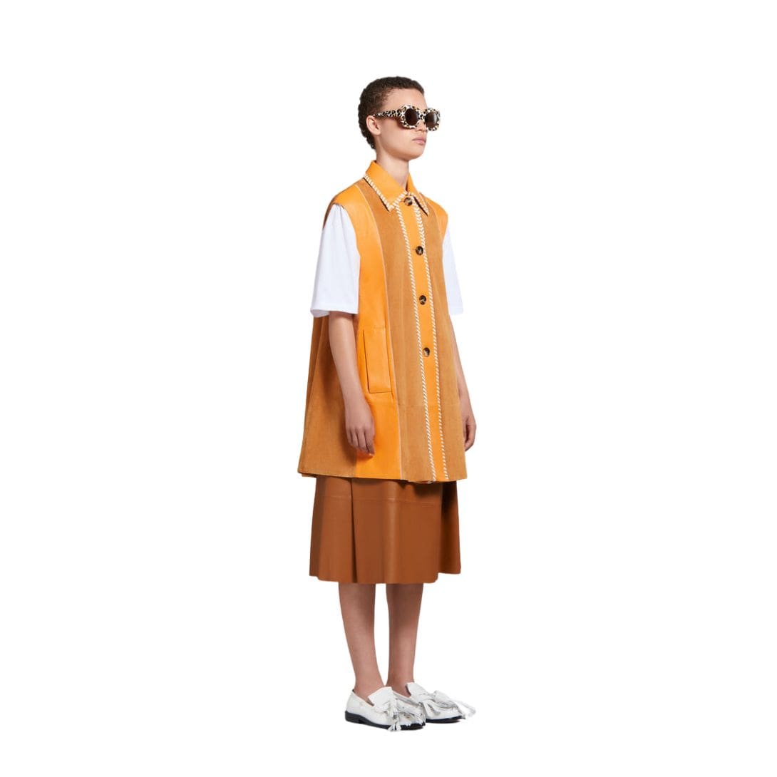 The silhouette of the dress is both flattering and modern, with a tailored fit that cinches at the waist and flares out into a gently flowing skirt. This design not only accentuates the figure but also provides ease of movement. The high neckline and sleeveless cut add to the dress’s streamlined appearance, making it a versatile piece that can transition seamlessly from day to evening wear. MARNI ORANGE SUEDE AND NAPPA PATCHWORK DRES