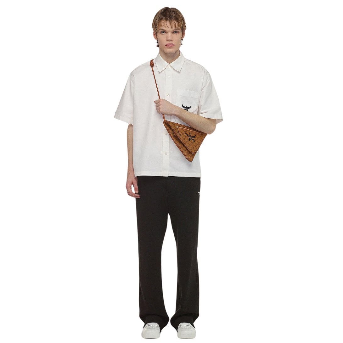 The pouch features natural Nappa leather accents throughout, including a leather strap with a generous drop of 23.6 inches, ensuring comfortable crossbody carrying. The MCM logo motif embellishes the front, serving as a subtle yet unmistakable mark of luxury.
