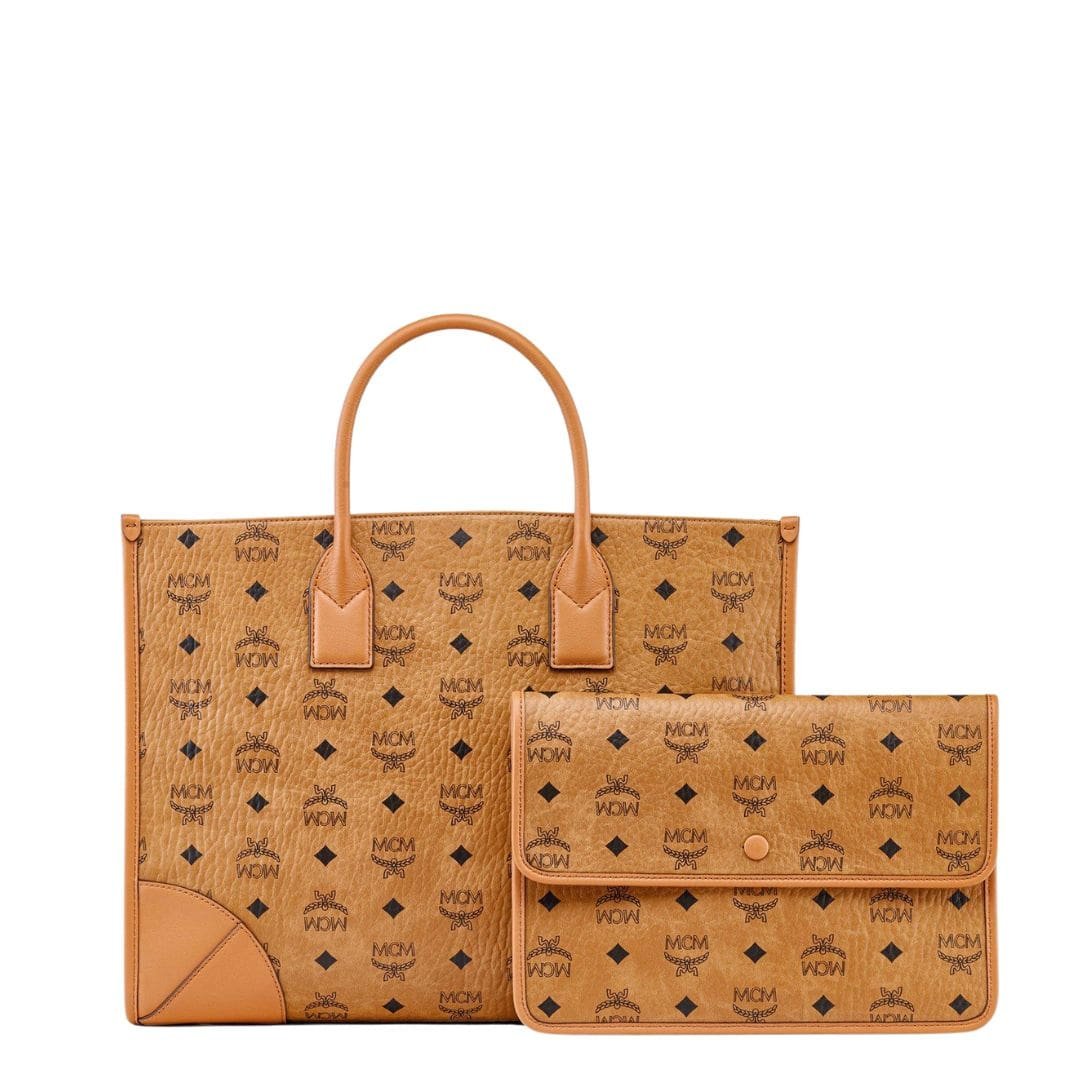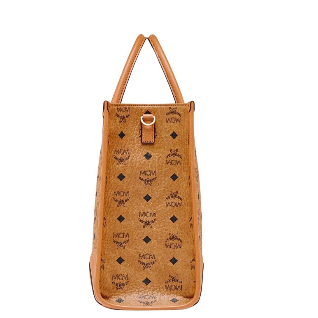 MCM Large Munchen Tote In Visetos Cognac. stands as a tribute to the brand’s origins in Munich, Germany. Designed to encapsulate the grandeur and cultural significance of its birthplace, this tote bag embodies the spirit of the Bavarian capital in every detail. Drawing inspiration from archival luggage, the tote features Nappa leather corners, a nod to the jet-setting heritage of MCM.