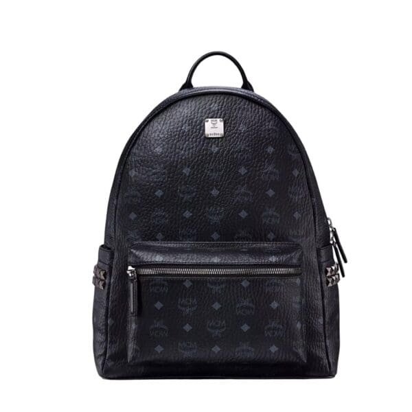 At the heart of its design lies the iconic MCM logo plate, a symbol of quality craftsmanship and sophistication. Framing the silhouette are brilliant pyramid stud trims embellishing the sides, adding an edgy finish and elevating the backpack’s aesthetic appeal.