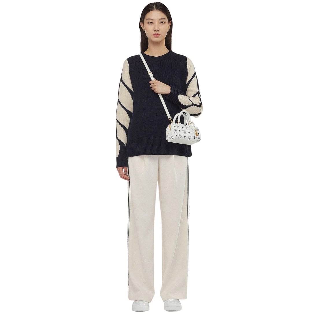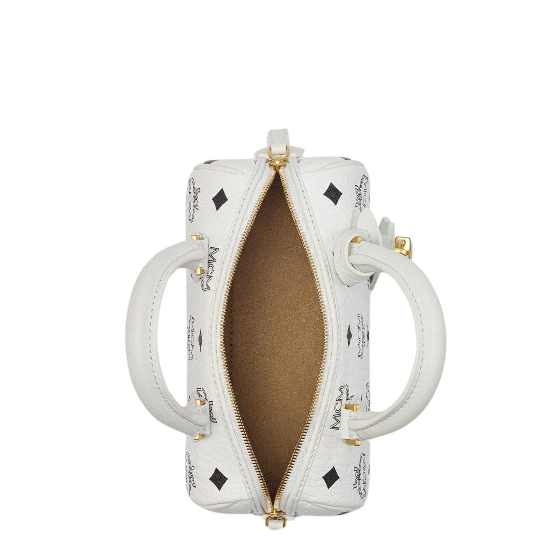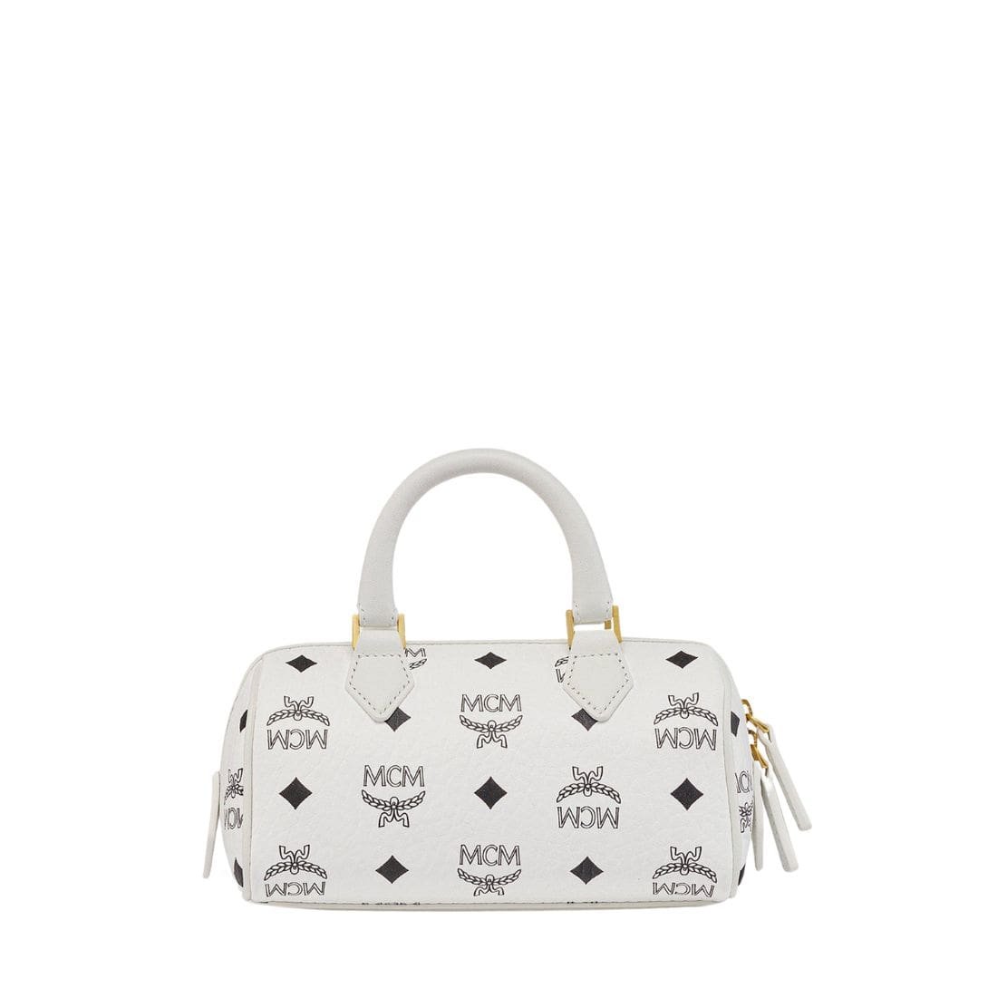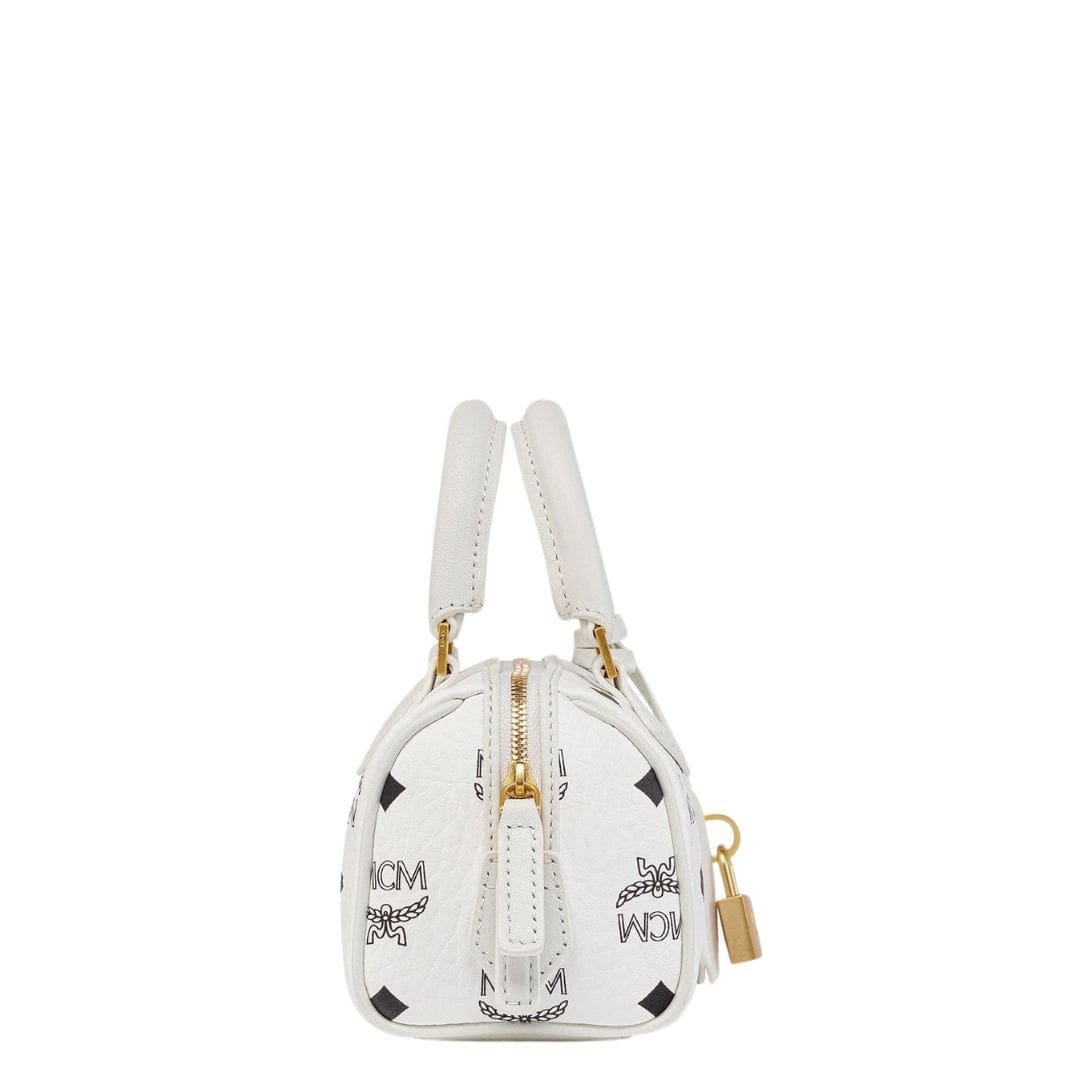 The MCM Mini Ella Boston Bag In Visetos White encapsulates the essence of everyday luxury, drawing inspiration from Munich’s Golden Age. Reflecting the elegance of vintage travel trunks, it features a leather hang tag and logo-engraved metal padlock, reminiscent of its jet-setting heritage.