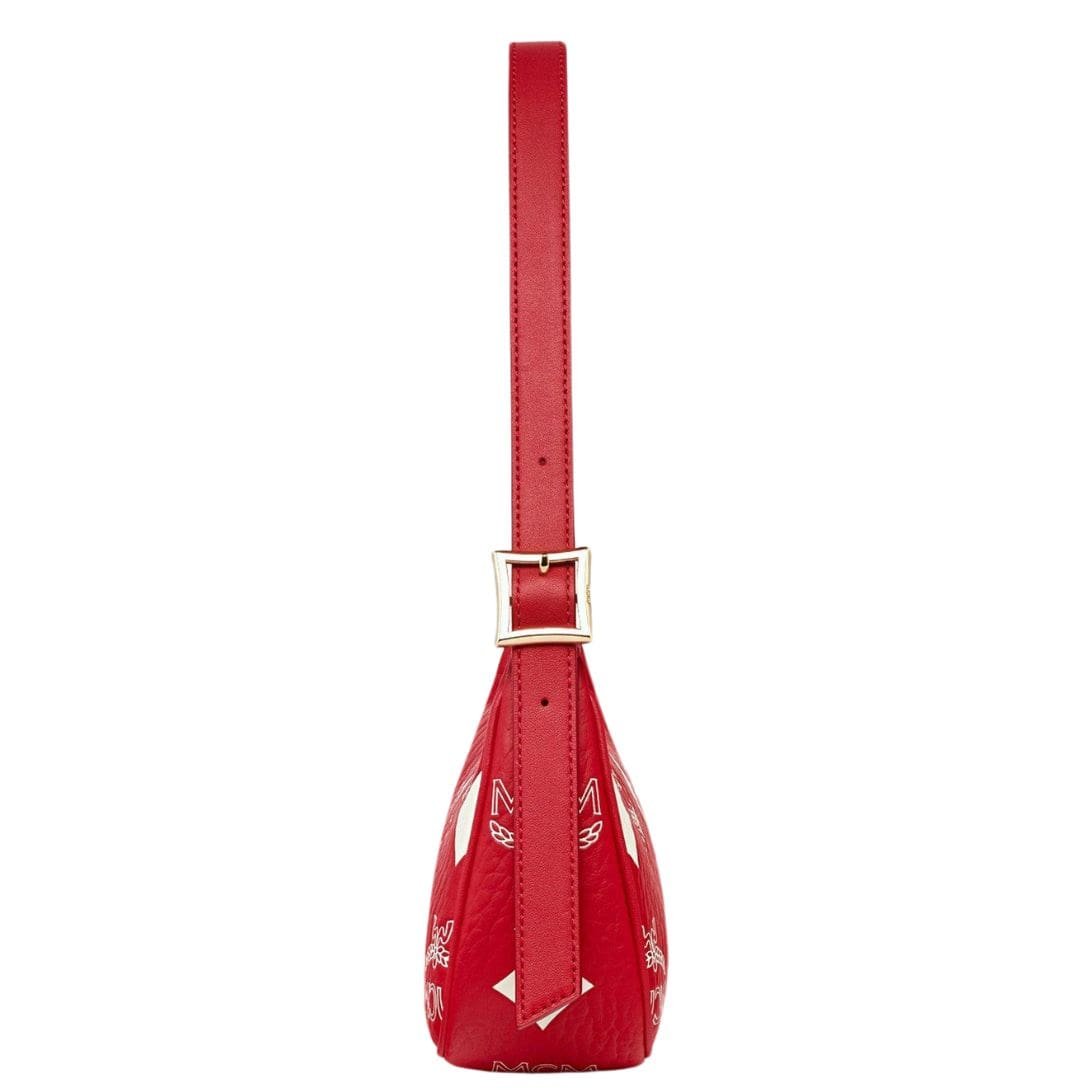 The MCM Small Aren Shoulder Bag in Maxi Visetos Candy Red epitomizes mobile elegance with its unique horizontal form, drawing inspiration from classic hobo silhouettes while pushing the boundaries of style.