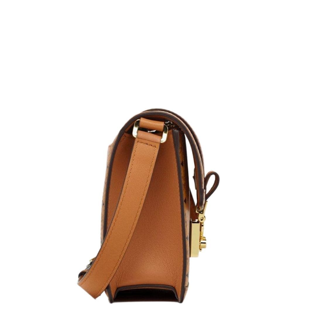 Crafted with meticulous attention to detail, MCM small Tracy shoulder bag In Leather Visetos Mix Cognac represents a contemporary interpretation of the timeless satchel design. Imbued with sophistication and elegance, this exquisite accessory seamlessly blends Spanish calf leather with the iconic Visetos monogram canvas, resulting in a harmonious fusion of textures and materials.