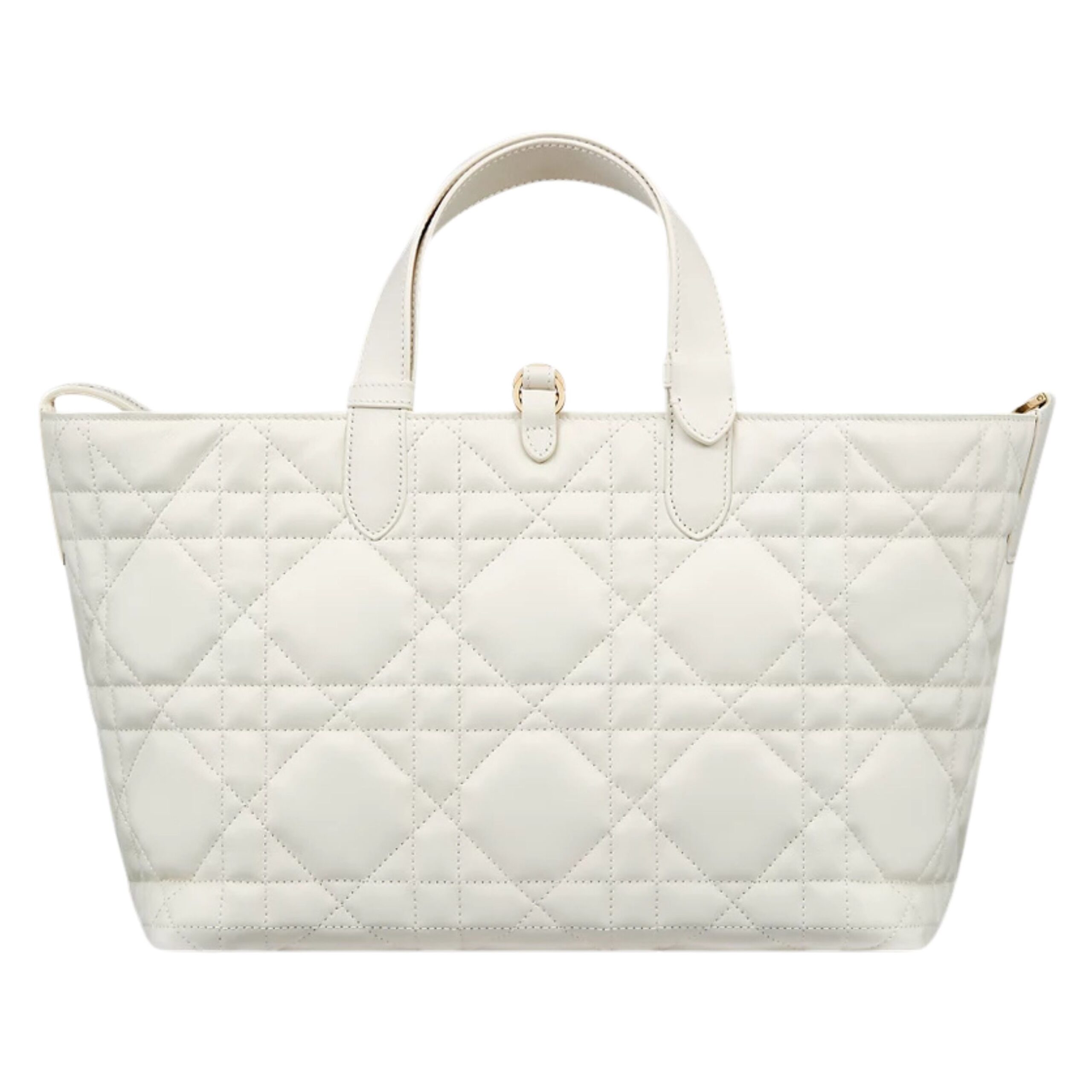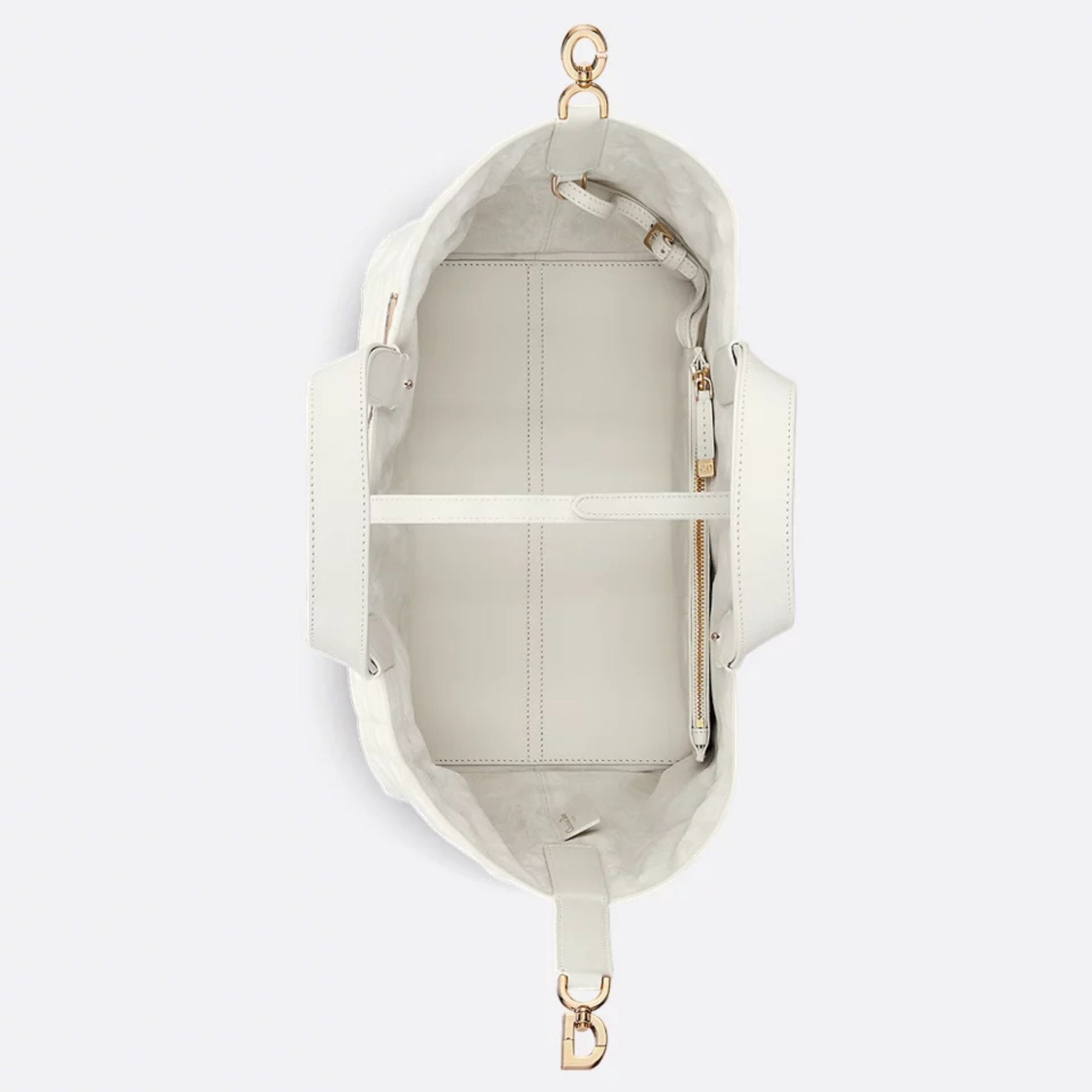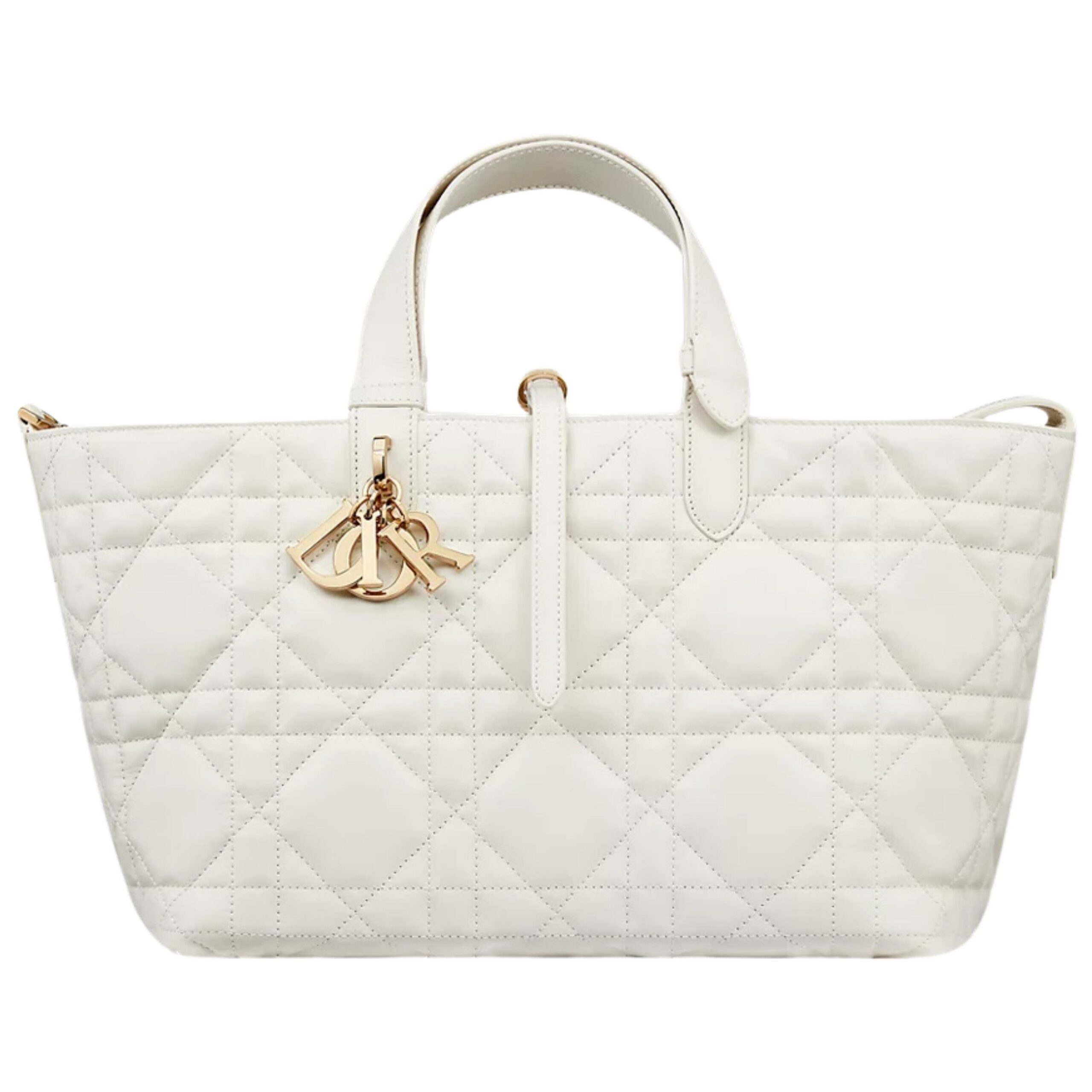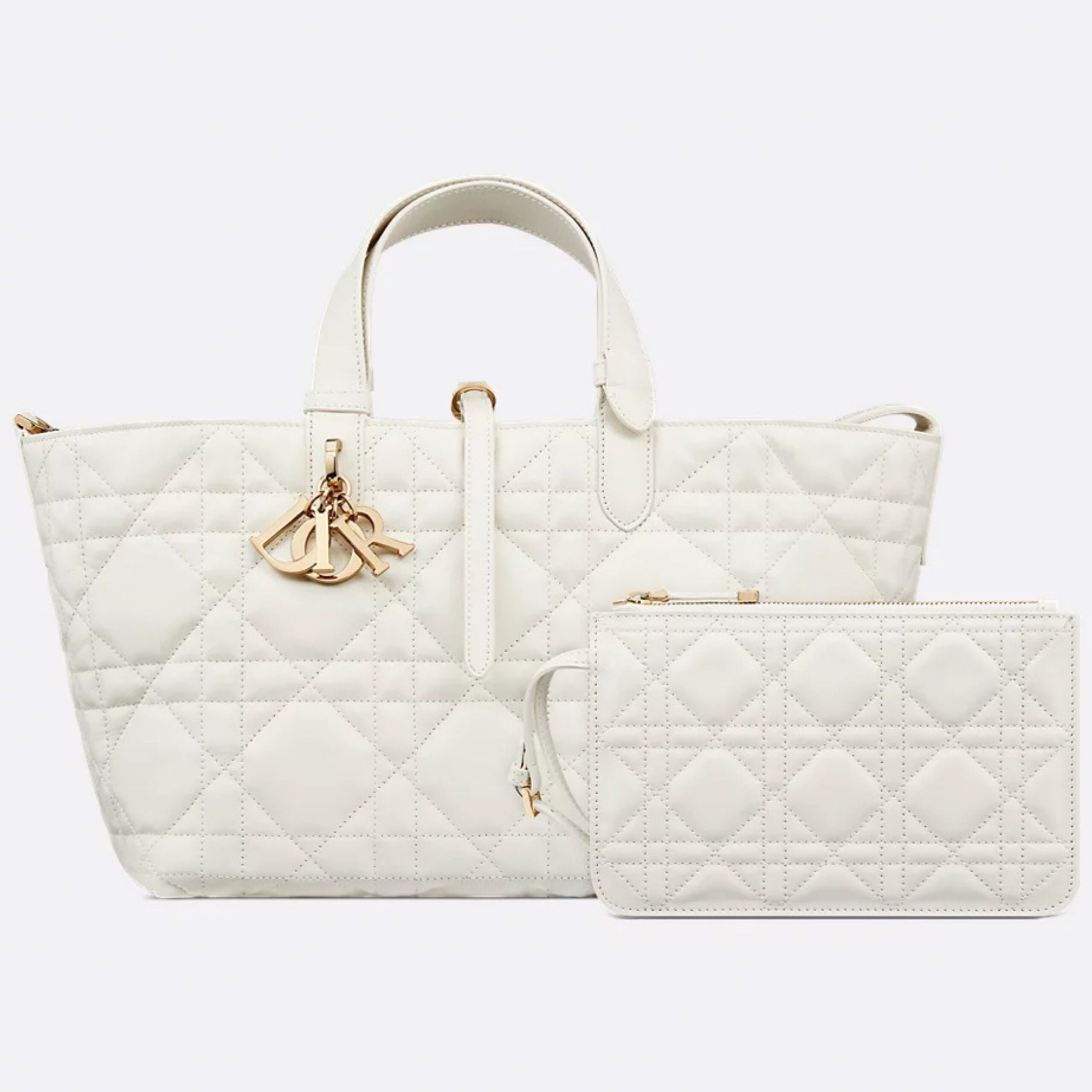 Designed to transition seamlessly from day to evening, the Medium Dior Toujours Bag features a spacious interior with a suede lining and a removable zip pouch that helps organize your essentials. The bag’s open design offers easy access while the leather strap closure with a CD-lock clasp ensures security and style. The signature “Dior” charms gently dangle from the handle, providing a delicate and unmistakable brand touch.
