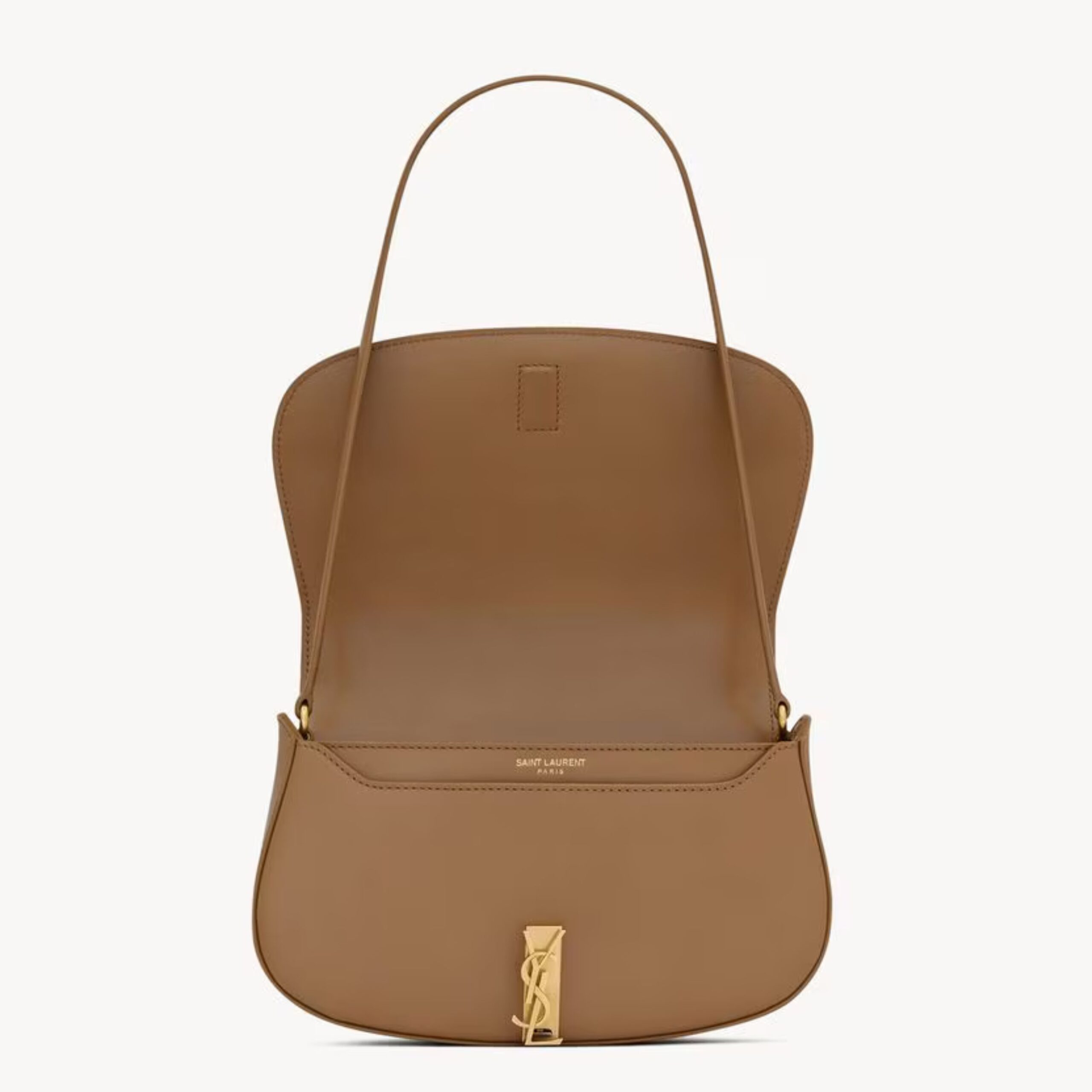 This mini-sized version of the Voltaire bag features clean lines, sharp edges, and a minimalistic design, making it an essential accessory for anyone who values both fashion and functionality. The rigid box calfskin gives the bag a rich, glossy texture that resists wear while maintaining its shape over time. The front flap is adorned with a subtle Saint Laurent signature, adding just the right amount of branding without overpowering the overall look.