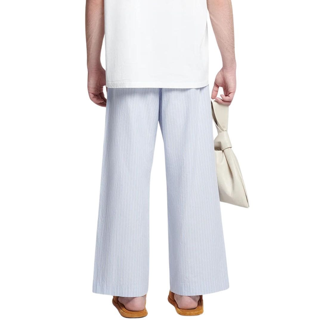 The NANUSHKA ARNAUD STRIPED RELAXED-FIT PANTS BLUE exude an effortless, sporty vibe, perfect for those seeking both style and comfort. Crafted with meticulous attention to detail, these pants feature a striking white, beige, and blue striped pattern that adds a dynamic flair to any ensemble. Designed to sit comfortably high on the waist, they boast a relaxed fit through the legs, ensuring freedom of movement without compromising on style.