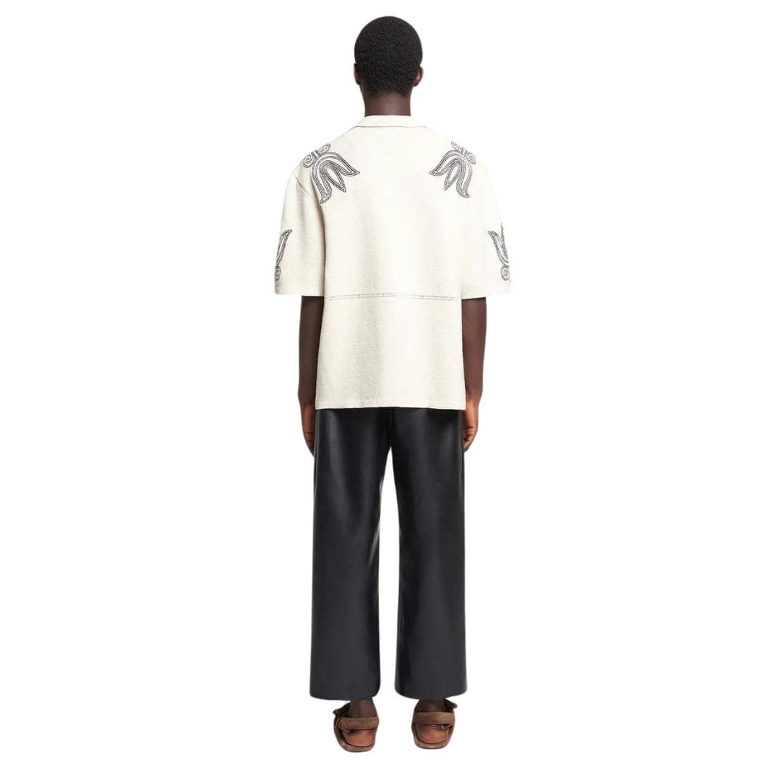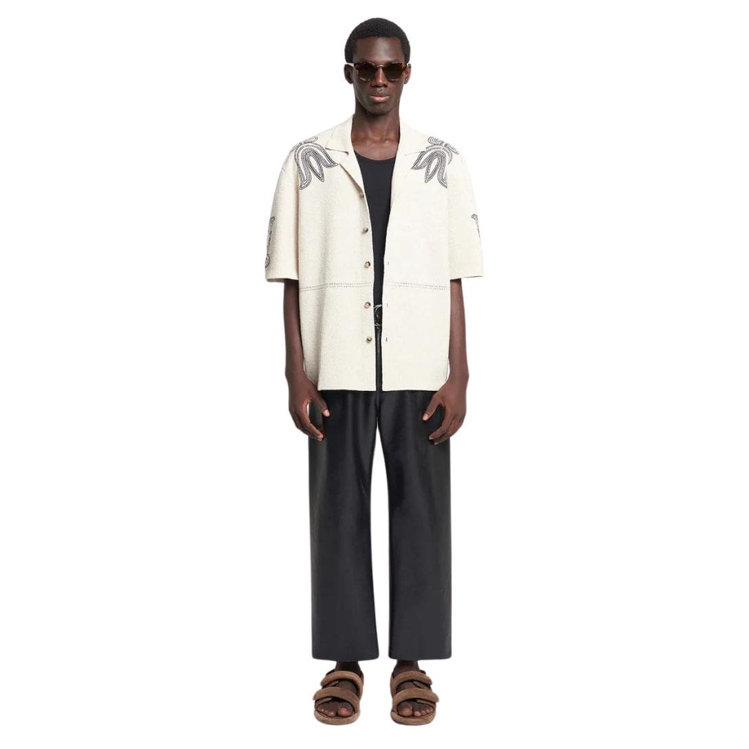 The standout feature of the Kaemon shirt lies in its attention to detail, with contrasting black floral motifs adorning the shoulders and sleeves, injecting a touch of modernity and visual interest into the classic silhouette. This intricate embroidery adds depth and texture to the shirt, creating a striking focal point that effortlessly catches the eye and elevates the overall look.