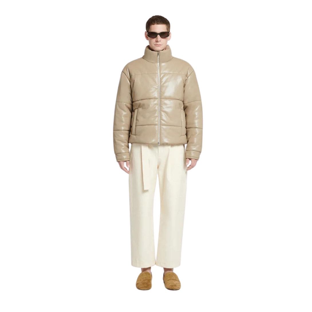 A Nanushka Marron Okobor Alt-Leather Puffer Jacket Ashy Taupe. puffer jacket is an indispensable item in any stylish wardrobe, combining functionality with fashion-forward design. The Marron jacket from Nanushka exemplifies this perfectly, offering a sophisticated take on the classic puffer. Crafted from Nanushka’s signature Okobor™ alt-leather in a refined ashy taupe hue, the Marron jacket is a testament to the brand’s commitment to sustainability and innovation in materials. This unique alternative leather not only mimics the luxurious feel and appearance of genuine leather but also aligns with environmentally conscious practices, making it an ethical choice without compromising on style.